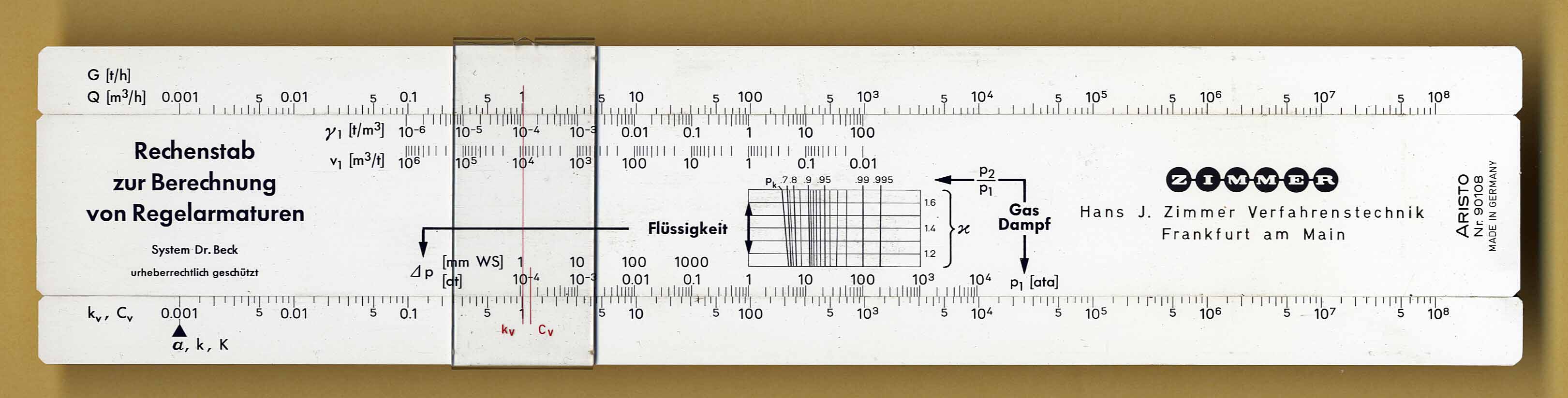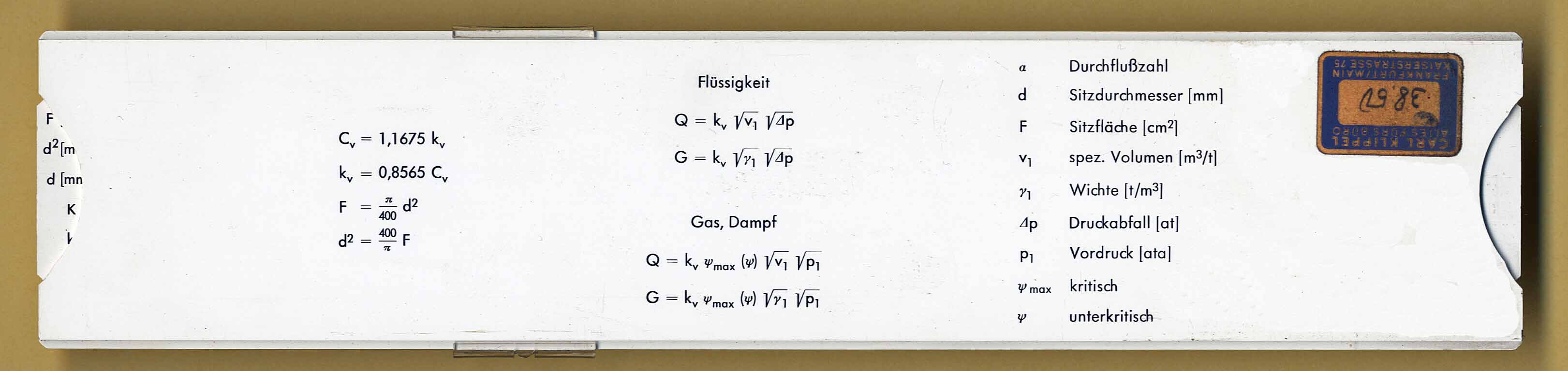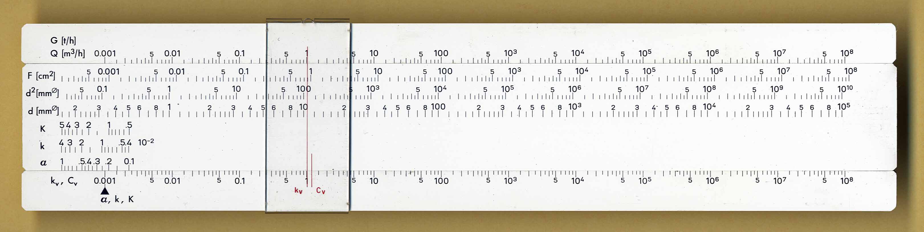Notes: 1) Rule for calculating control valves 2) Has more scales on the reverse side of the slide 3) Has formulas on the reverse side.