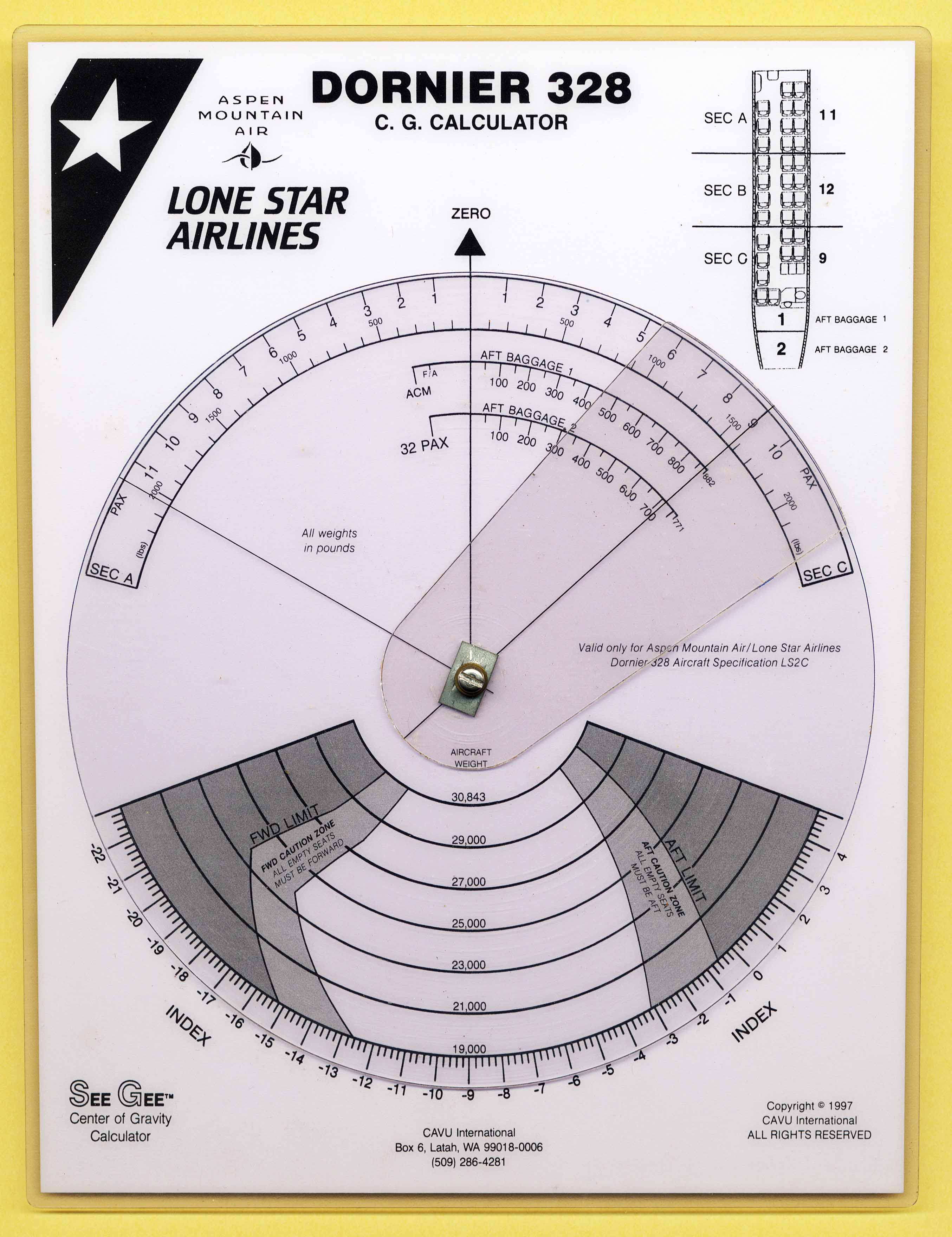 | Disk/Plate | Aspen Mountain Air / Lone Star Arilines / Dornier / 328 | CAVU International | Plastic | c. 1997 | Dia. = 19.7 cm / 21.9 cm x 28.5 cm | Weight & Balance |