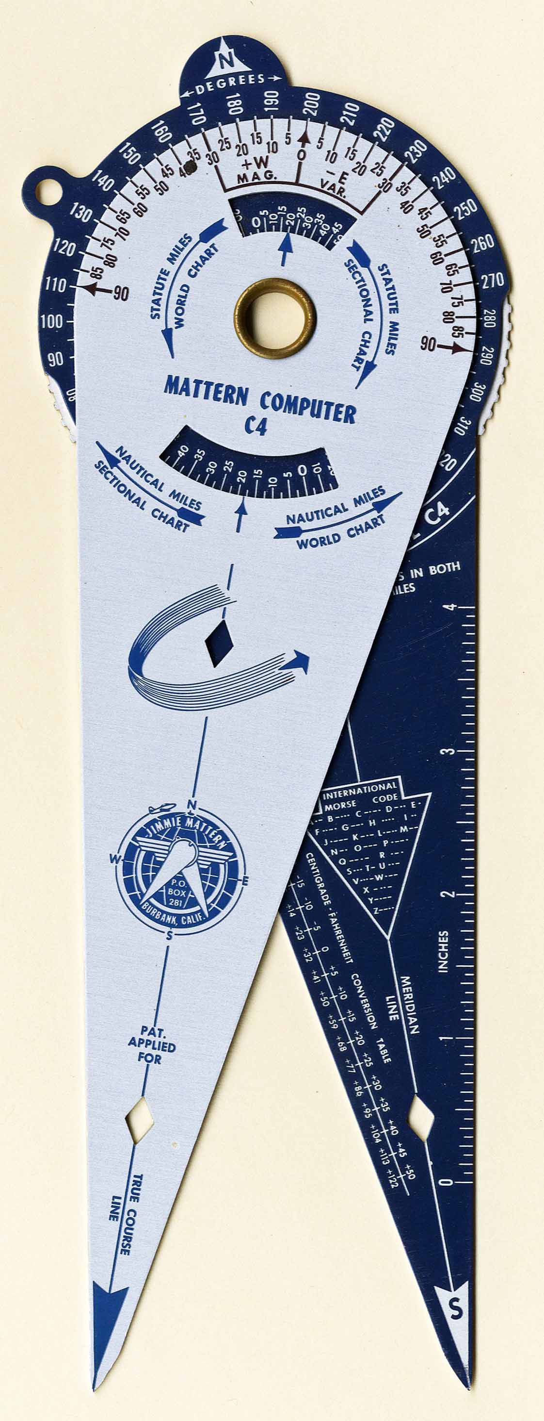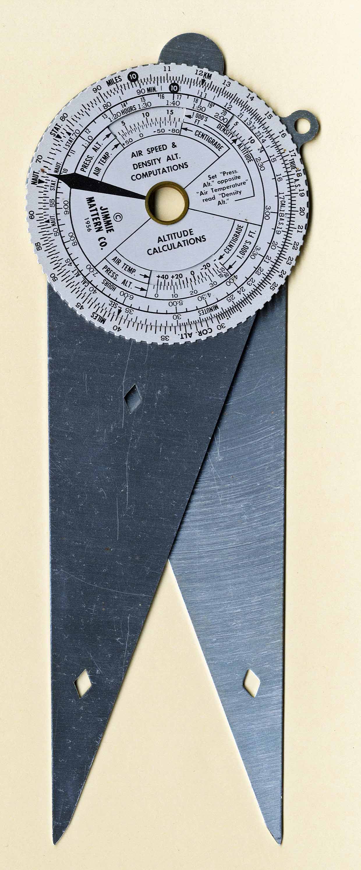 | Disk / Dividers | Generic Instrument | "Jimmie Mattern Co. (Burbank, CA)" | Metal | c. 1956 | Dia. = 8.3 cm / L = 24.1 cm | Flight Management & Planning |