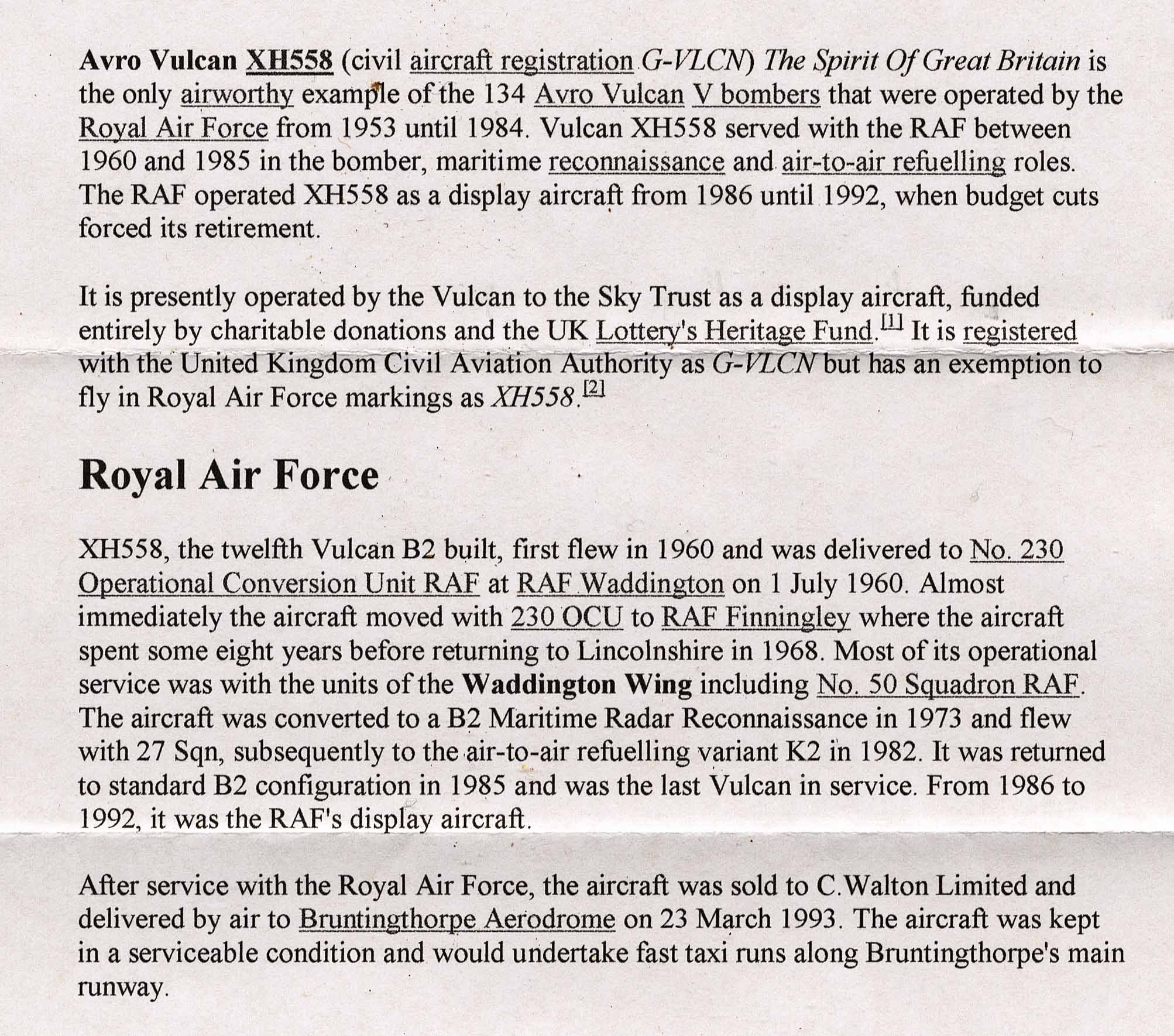Comment: Note the Spirit of Great Britain (XH558) is one of the last Vulcan Aircraft still flying. Inside the metal case is marked XH-558.