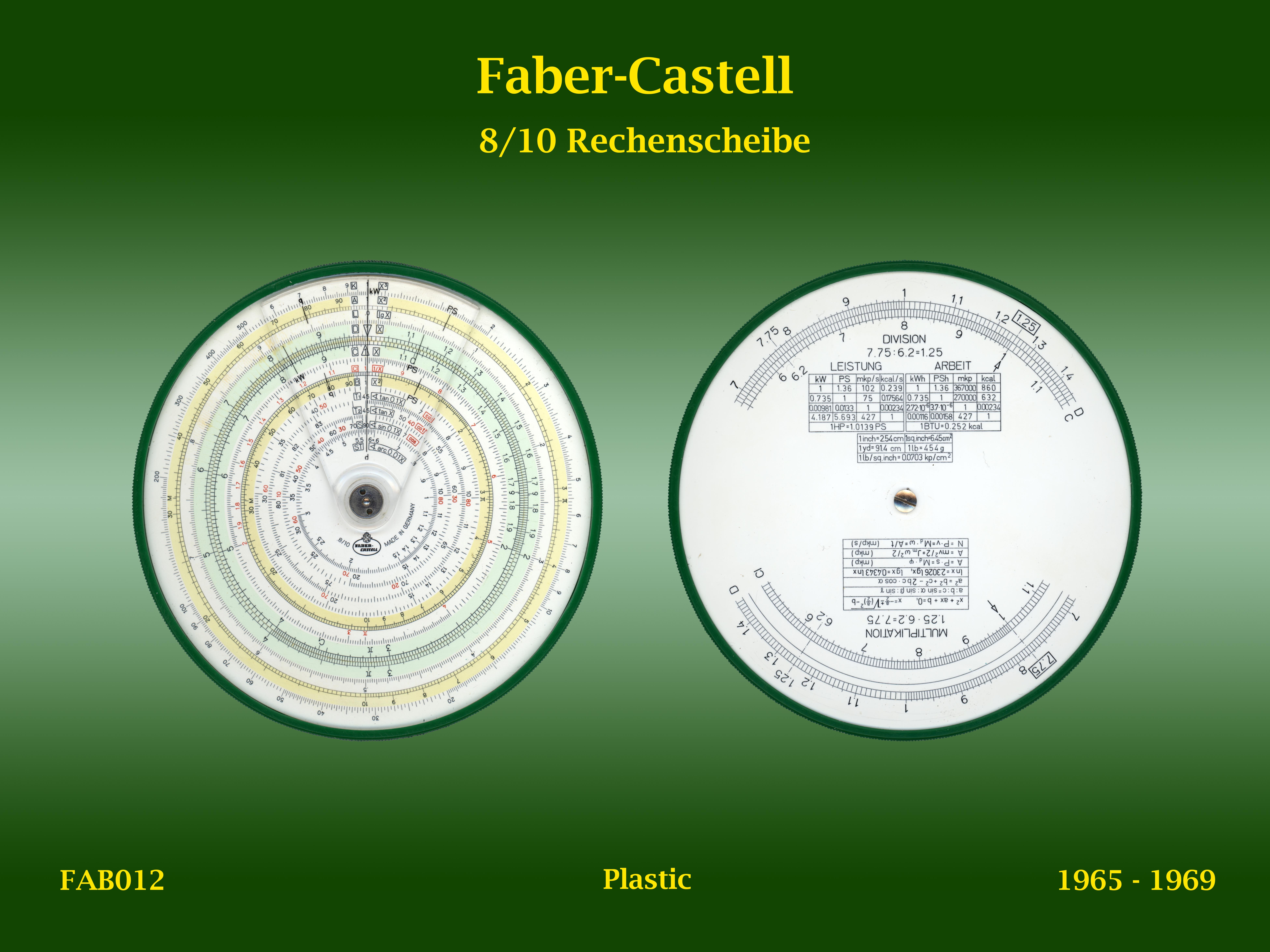 | FAB012 | Circular | 8/10 | Rechenscheibe | Faber-Castell | Germany | Plastic | Ø12.5 cm | 1965-1975 | C2 |