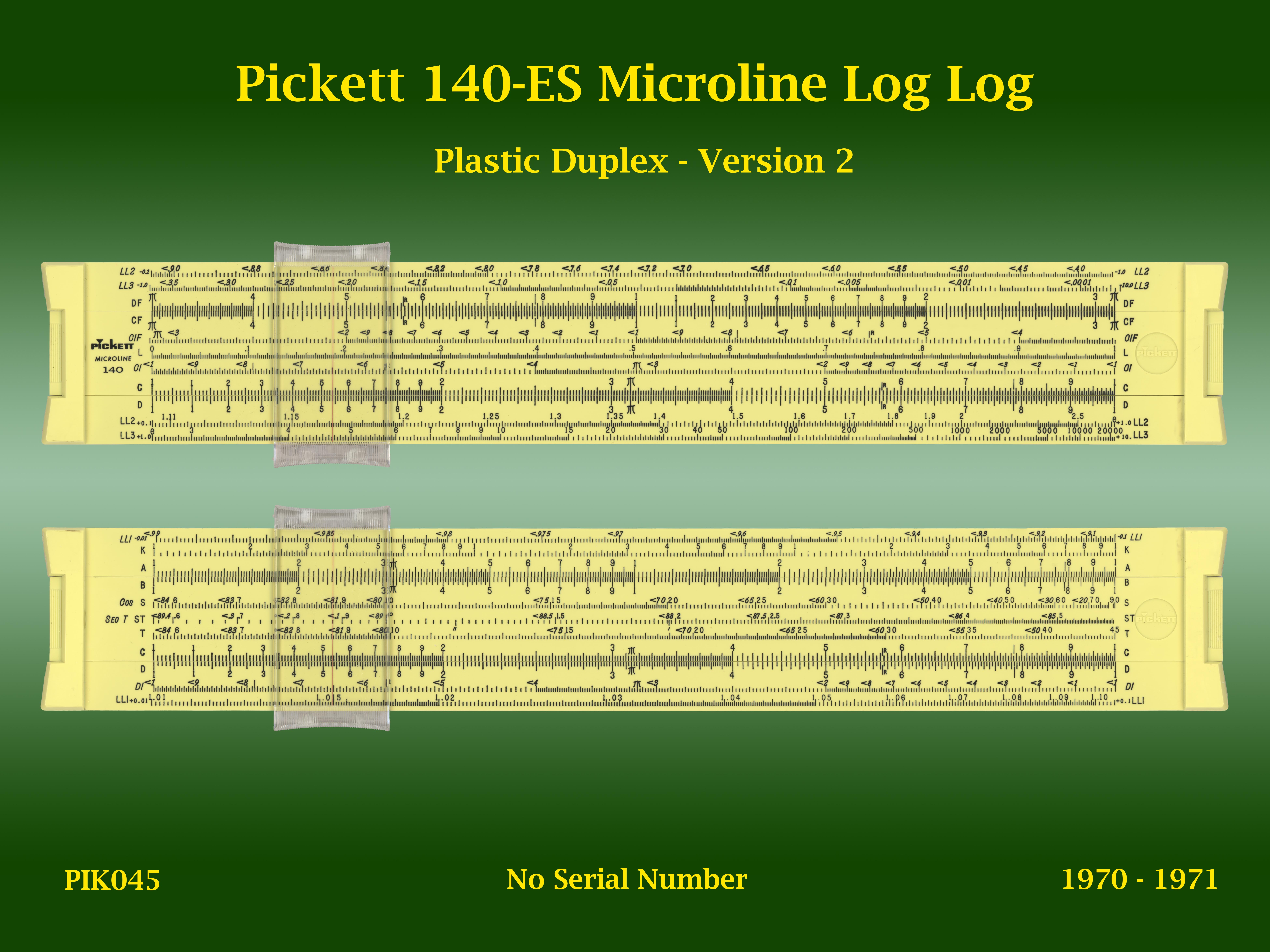 | PIK045 | Linear | 140-ES | Microline Log Log | 2 | n/a | Pickett | USA | | Plastic | "10" | 1970-1971 | C3 |