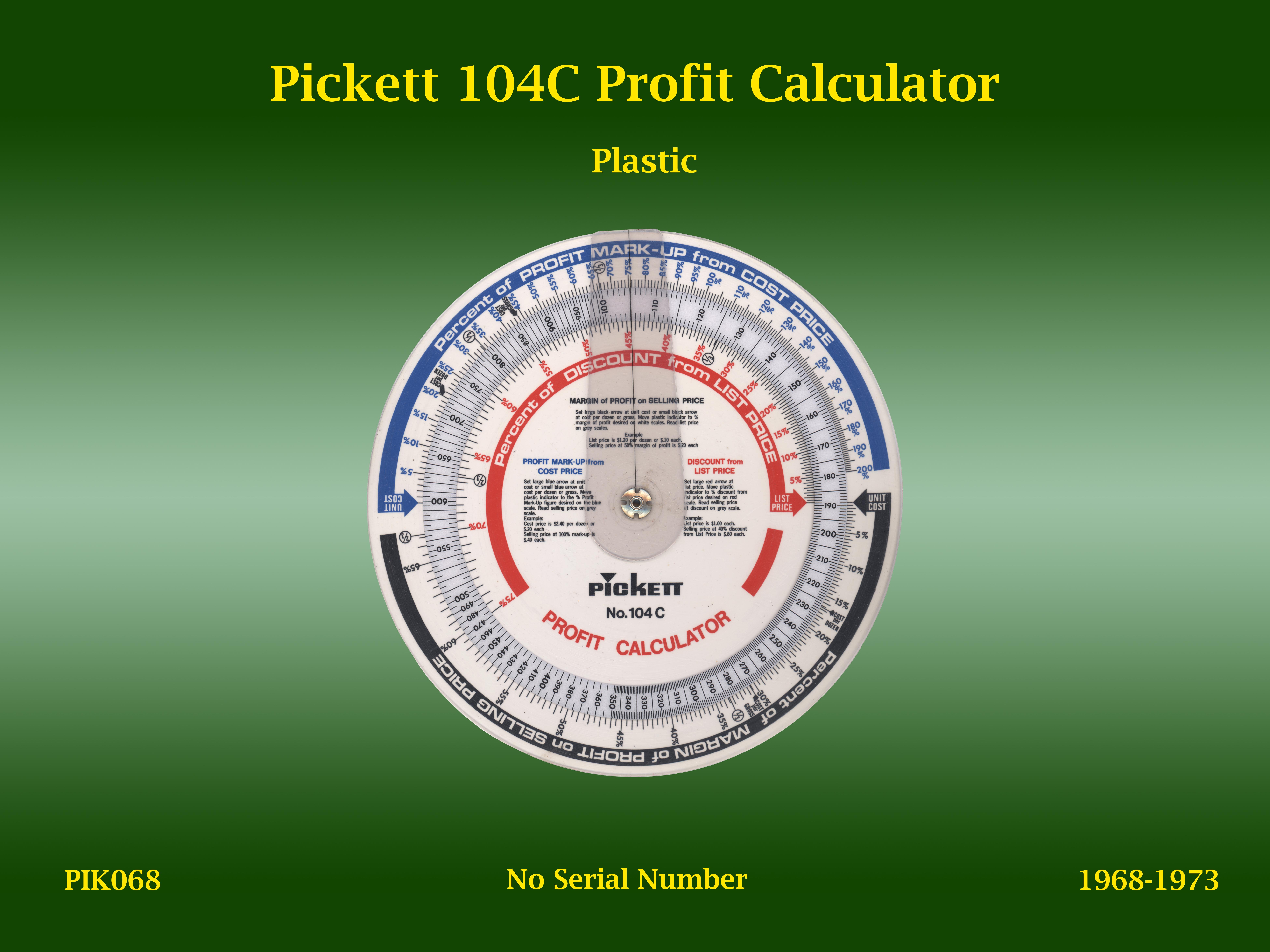 | PIK068 | Circular | 104C | Profit Calculator | | n/a | Pickett | USA | | Plastic | "8" | 1968-1973 | C4 |