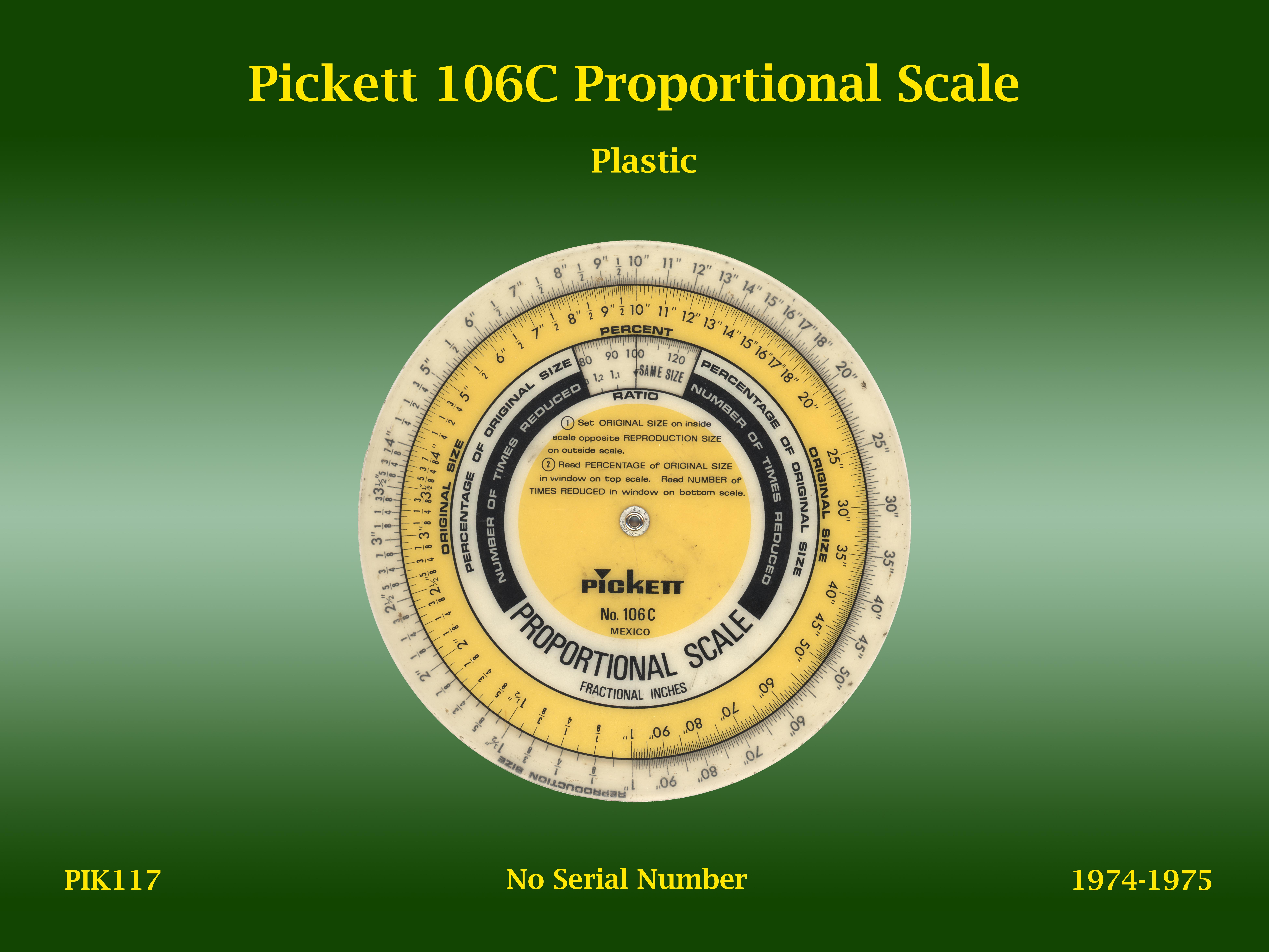 | PIK117 | Circular | 106C | Proportional Scale | | n/a | Pickett | Mexico | | Plastic | "5.75" | 1974-1975 | C5 |