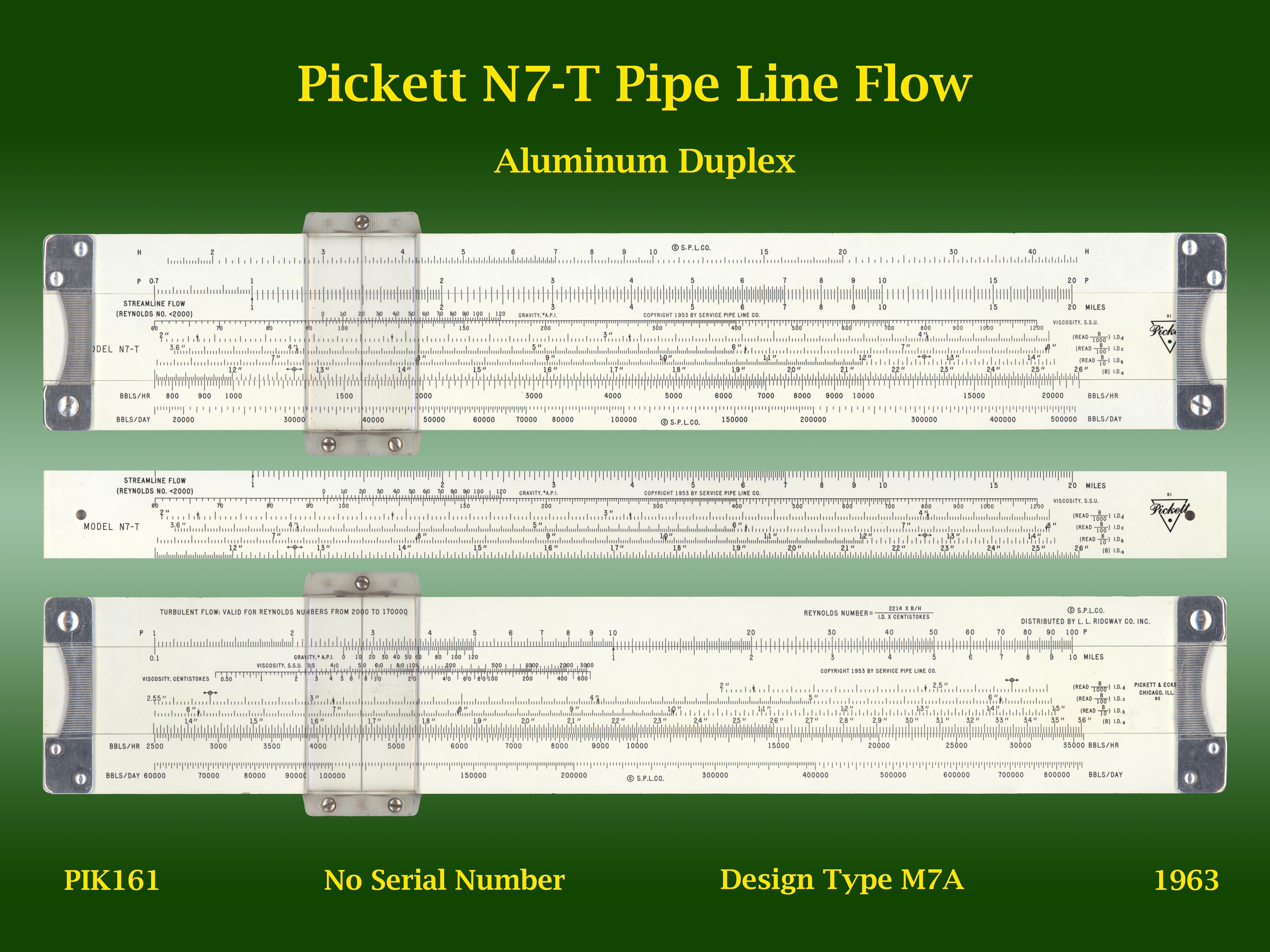 Notes: Special slide rule made for Service Pipe Line Co. Used for making various flow calculations for petroleum pipelines.