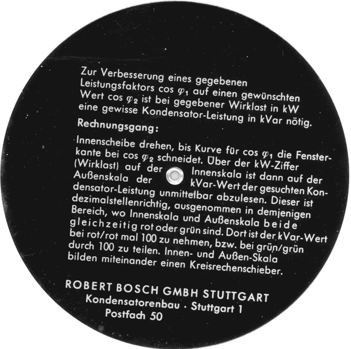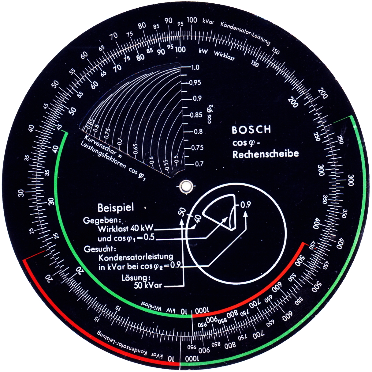 Scales Front: Top Disk: Effective Load kW, cos φ2, example of use. Bottom Disk: Capacitor performance kVar, set of curves for Power Factor cos φ1