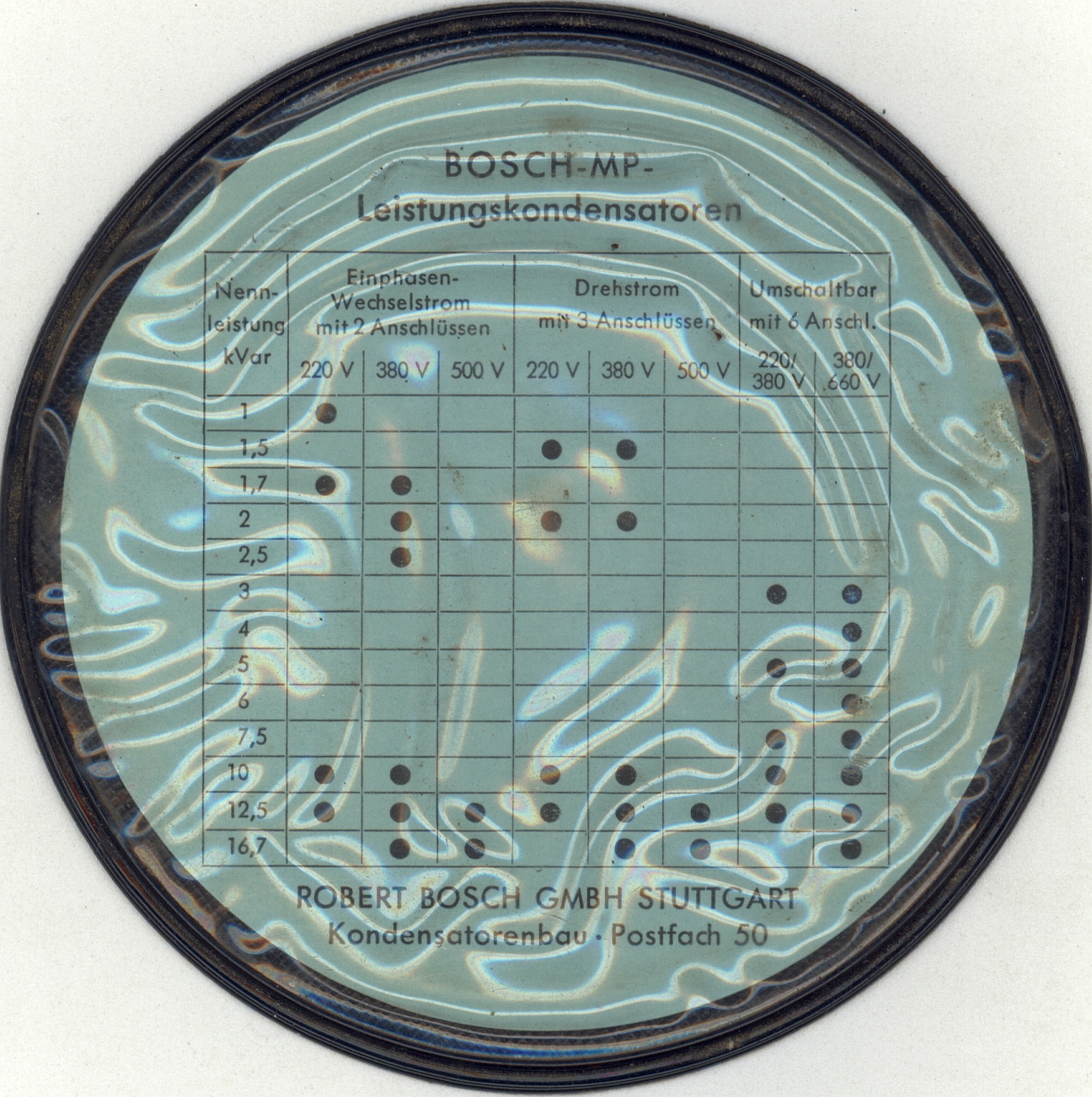 Came with: orig. black plastic slipcase with table insert showing available Bosch MP Power Capacitors.