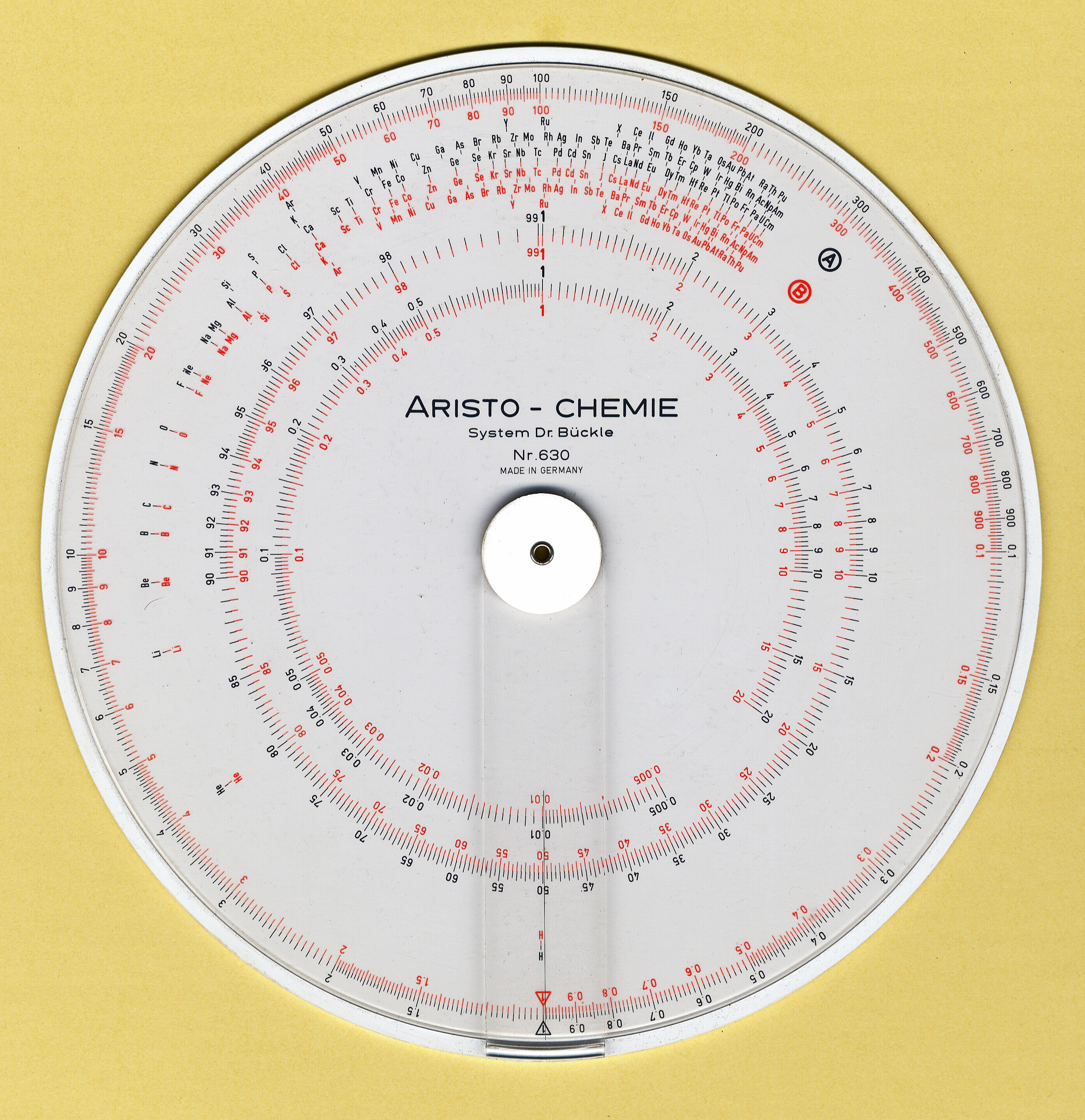 1) Large circular slide rule with elements by atomic weight 2) First appeared in the 1960 Aristo catalog