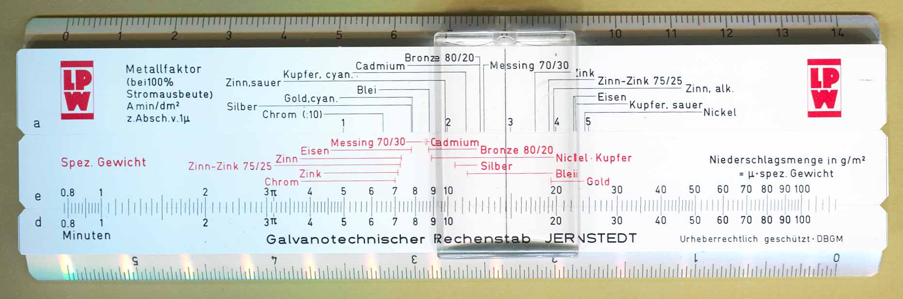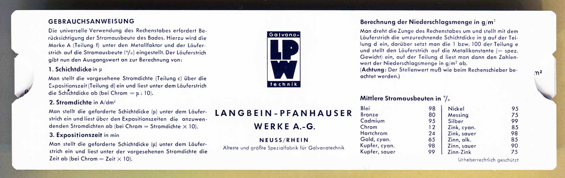 Notes: 1) Used in electroplating deposition calculations for various metals 2) Made for the Langbein-Pfanhauser Werke