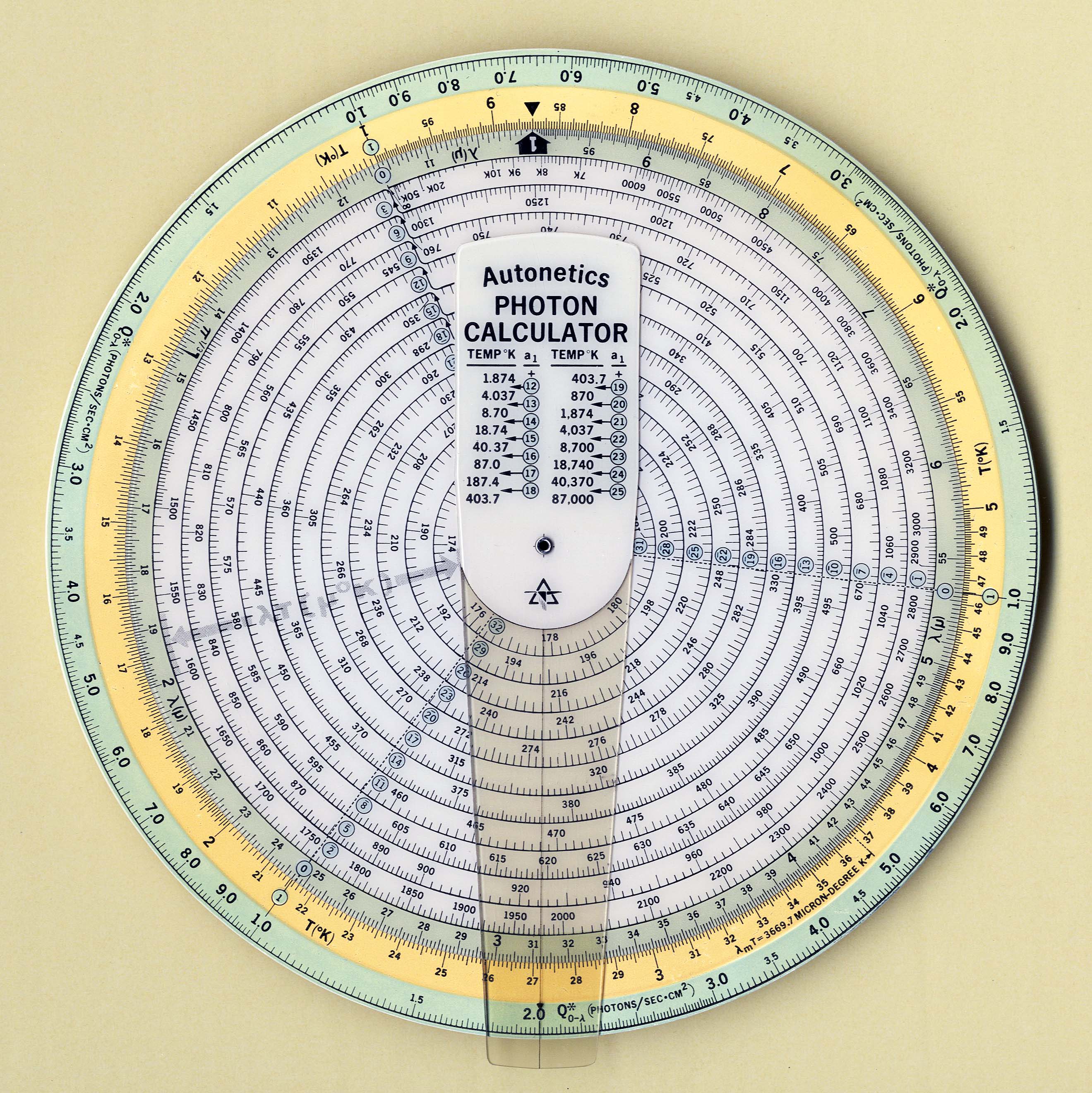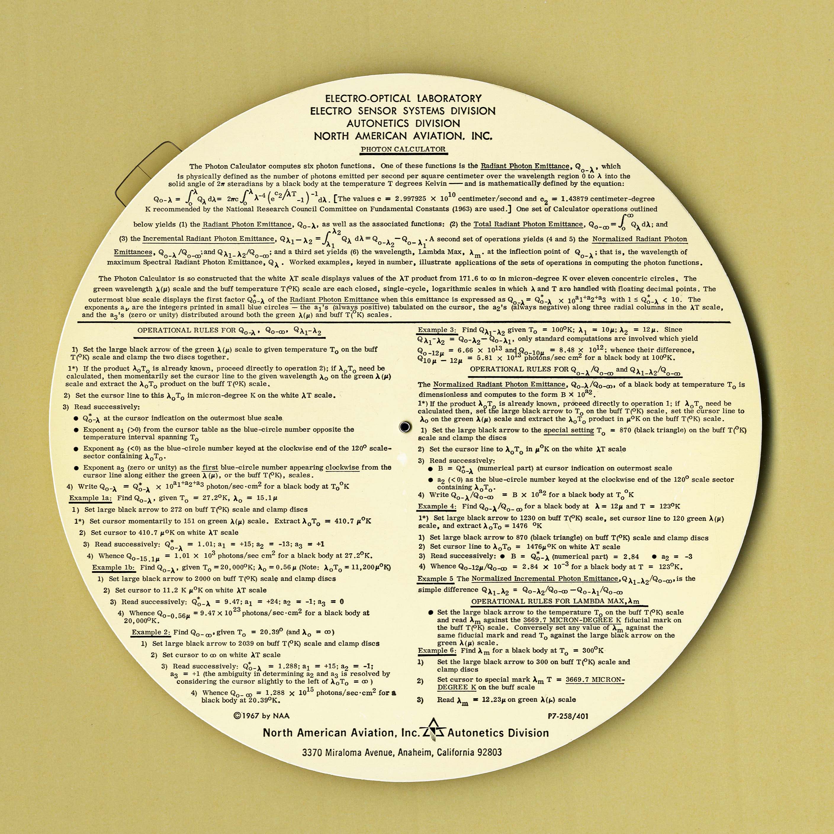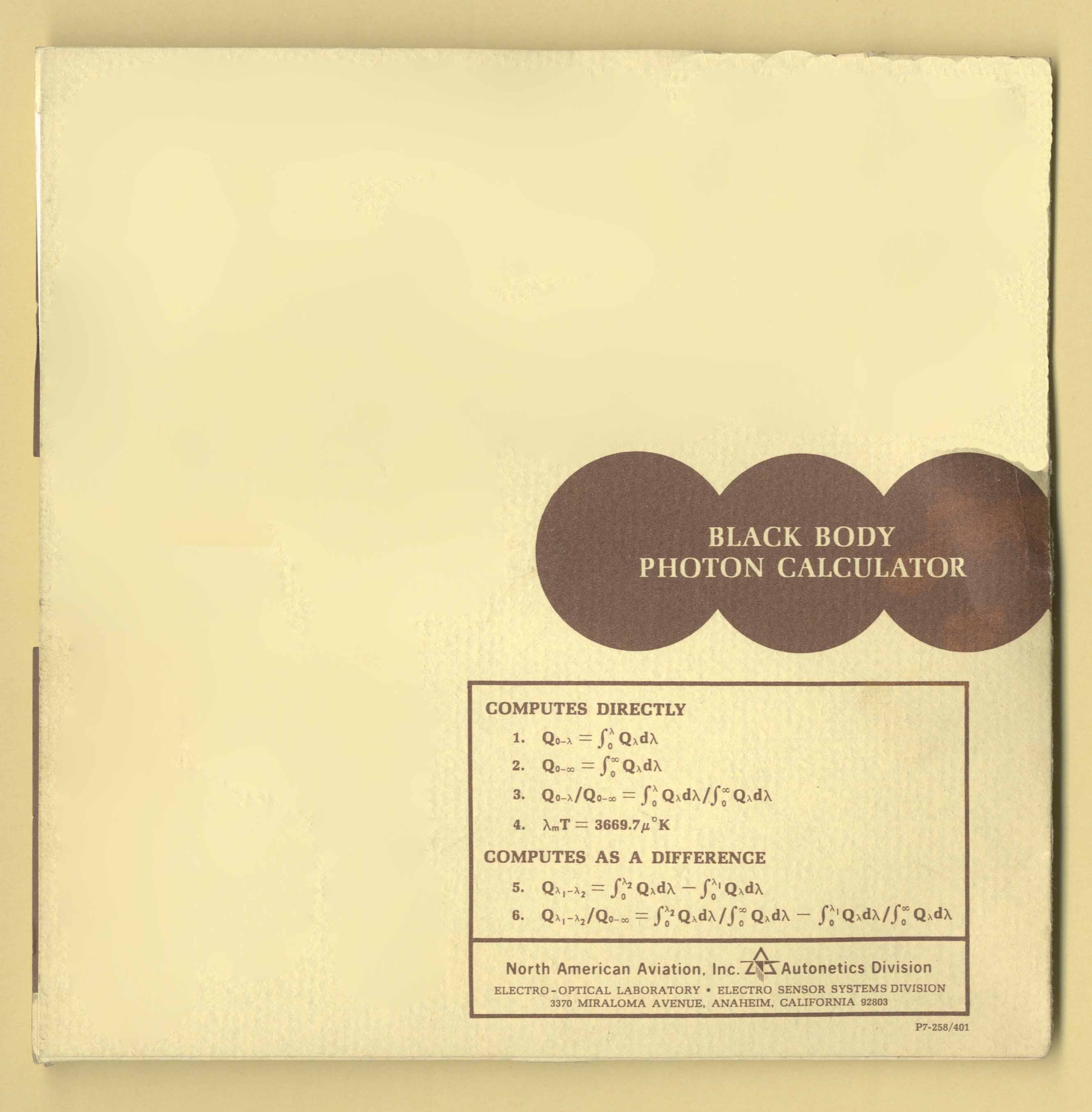 Notes: 1) Very rare slide rule designed for internal use at NAA 2) Calculates the incremental photon emittance for a blackbody 3) This rule was the only one capable of calculating photon emittance in a finite spectral band over a span of 45 orders of magnitude!