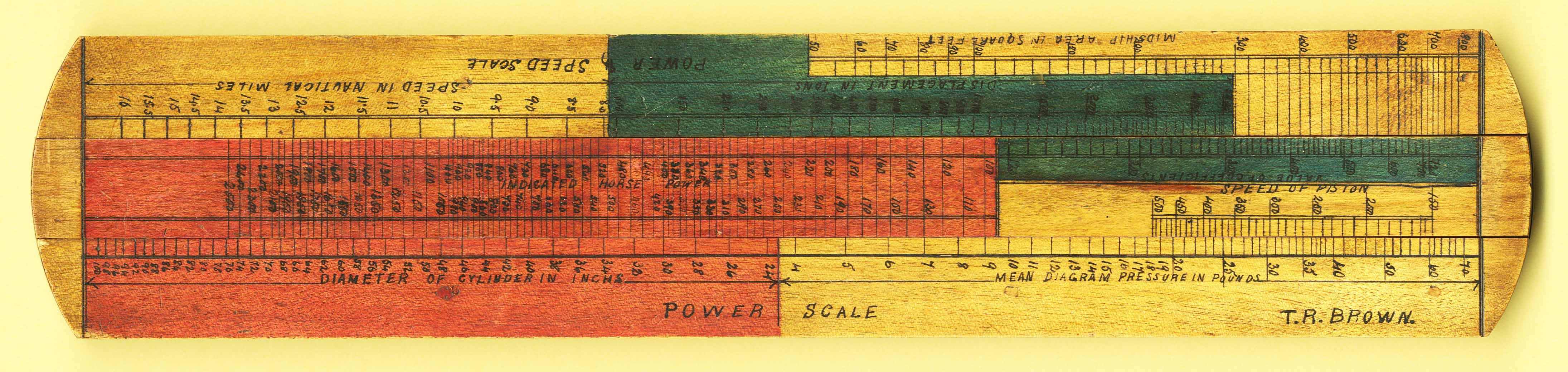 Nautical steam engine proplusion calculations. Handmade slide rule with unusual colors and scales