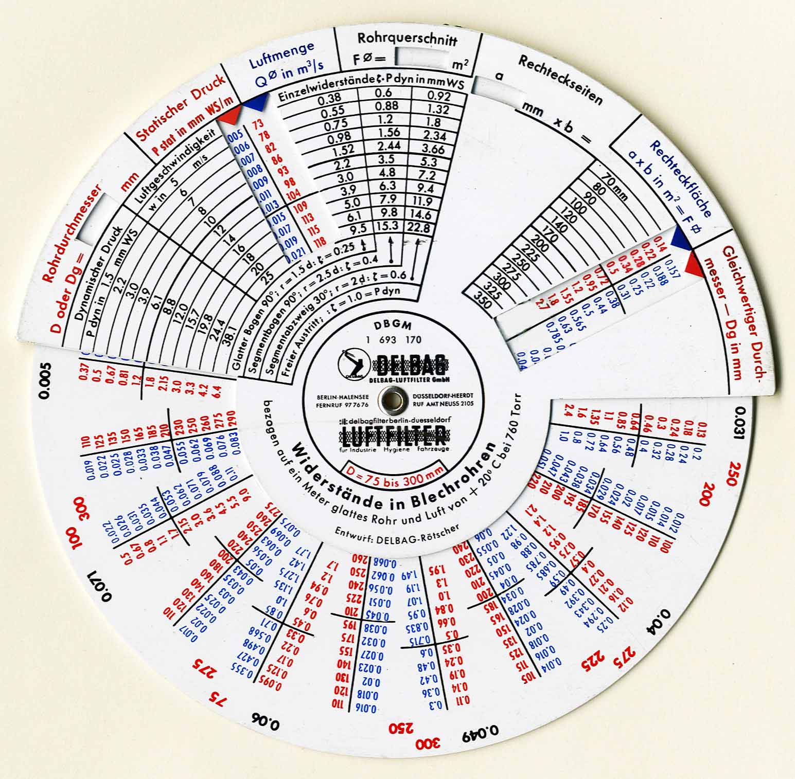 1) Specialized slide rule used for ducting and pipe flow calculations 2) DELBAG is a German air filtration company for industrial air pollution control.