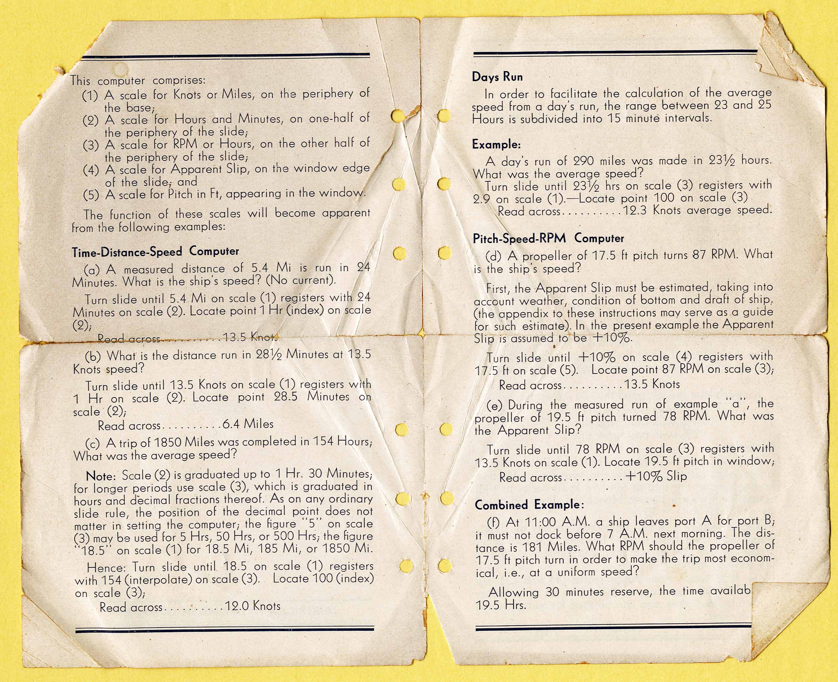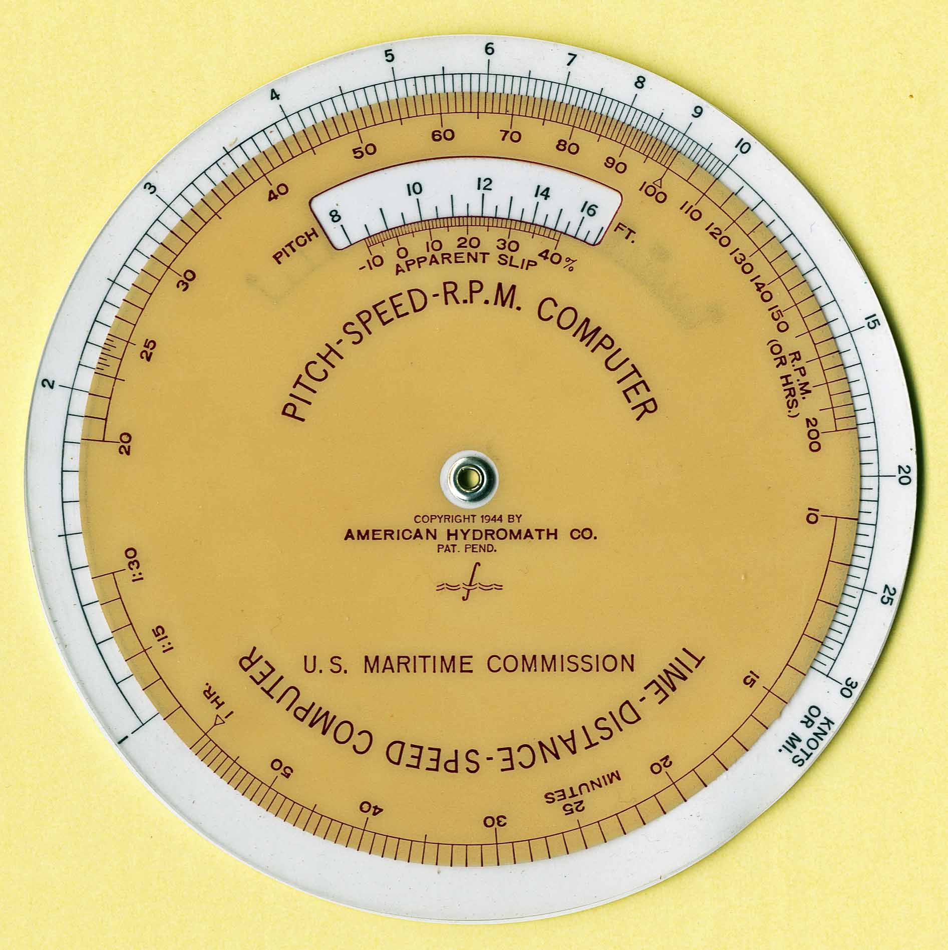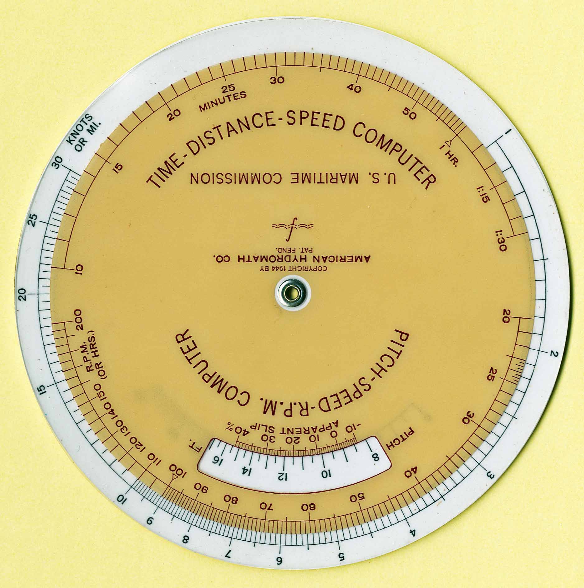 "Used to calculate time, distance and speed. Includes scales to include propeller pitch and revolutions in the calculations."