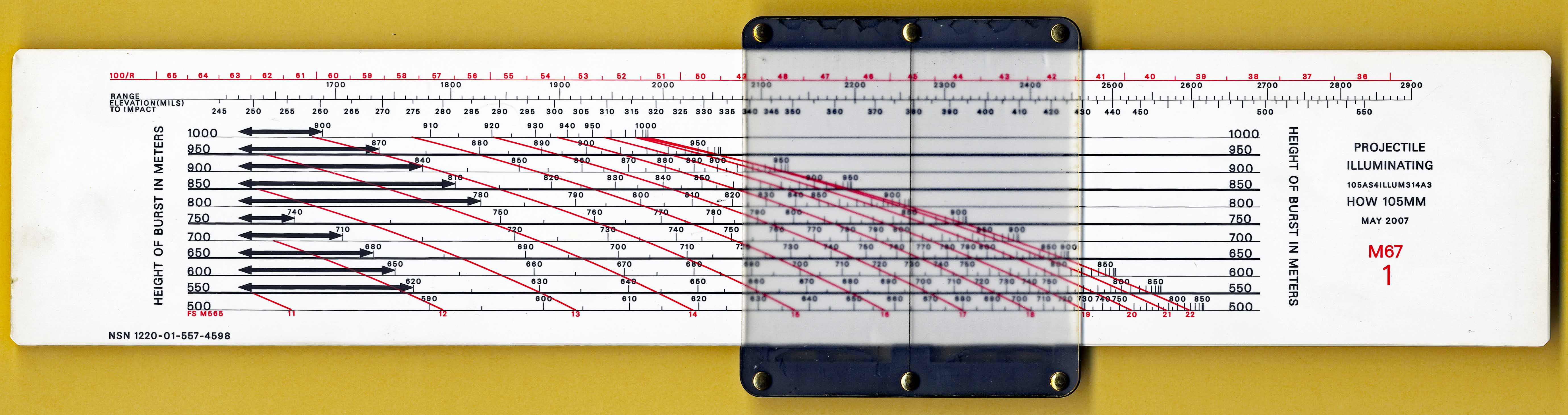 Three slide rules to calculate 105 mm height of projectial for illumination