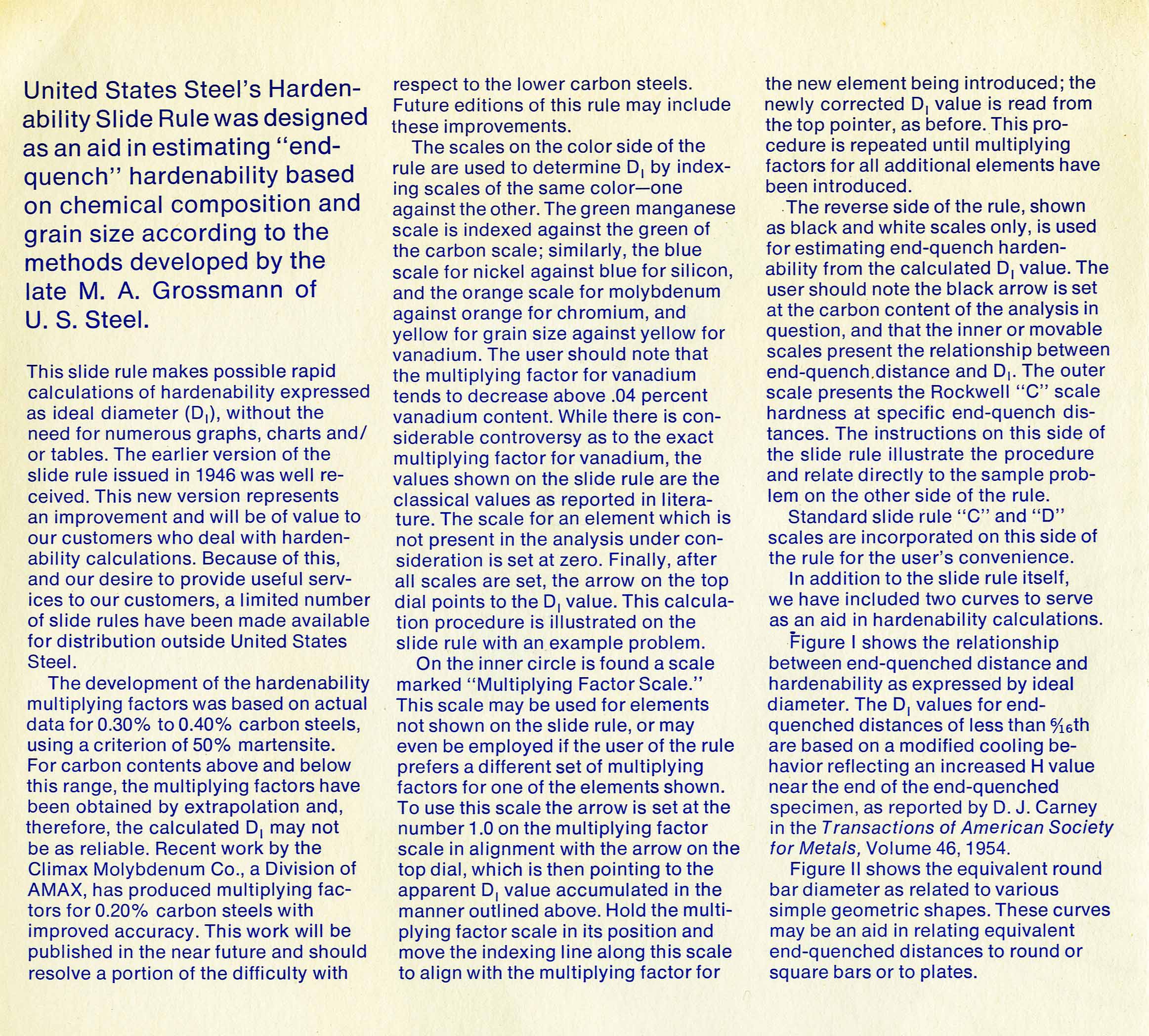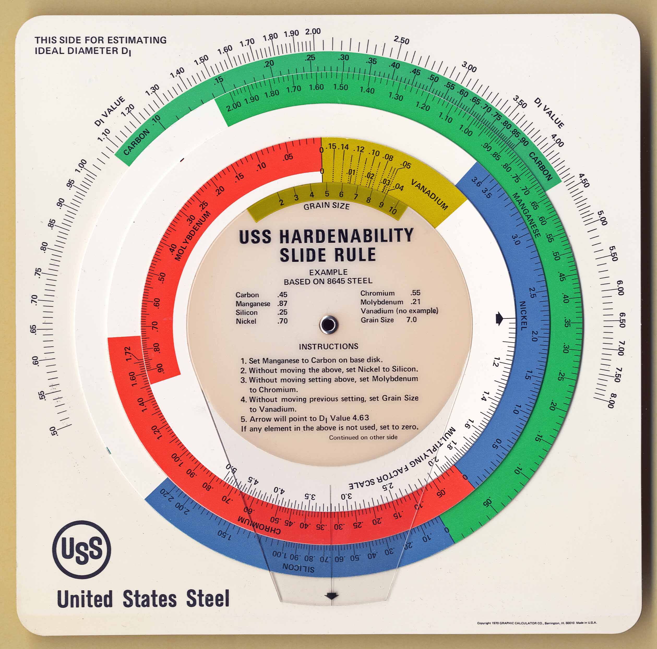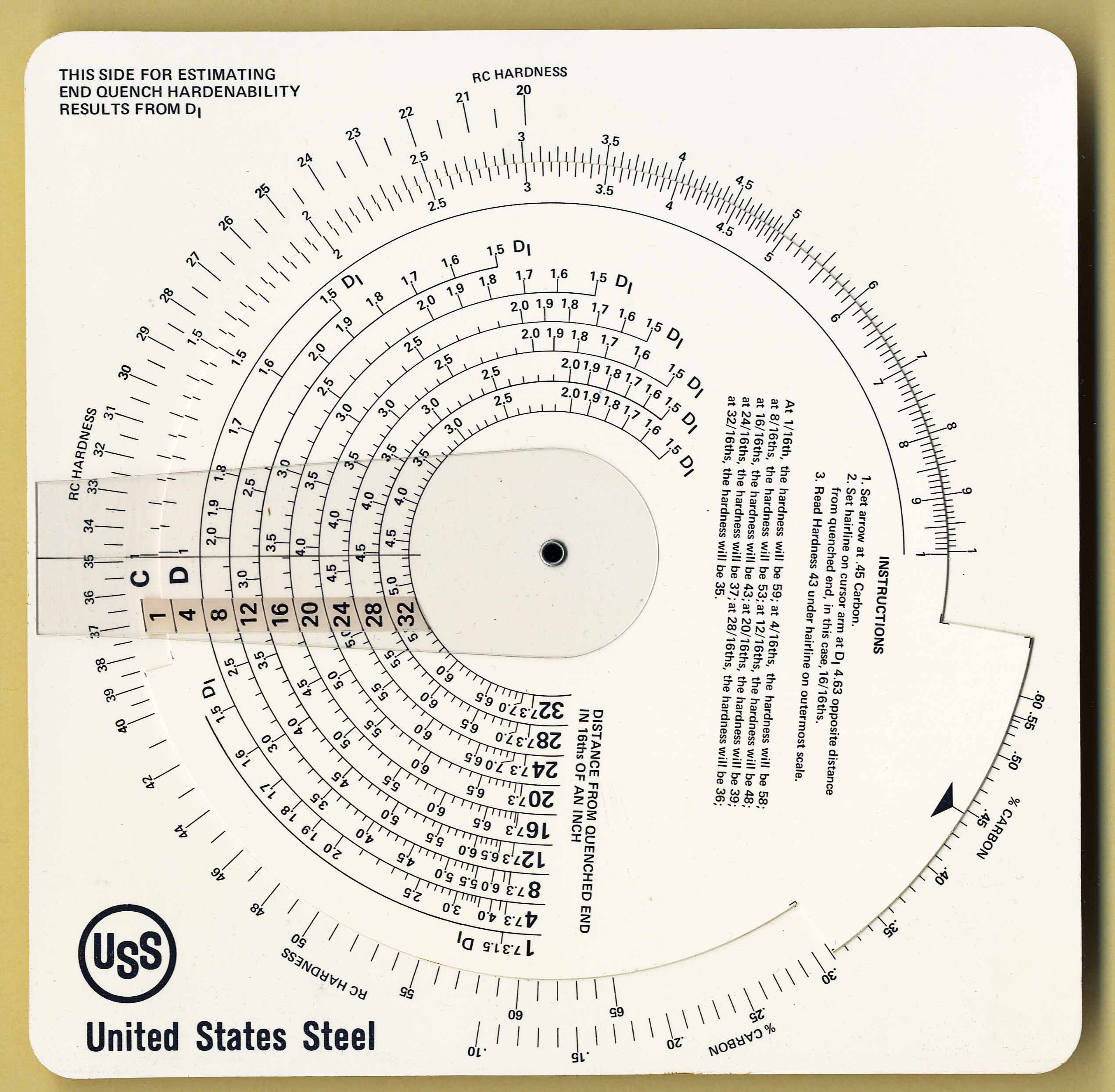 "1) Used to determine hardenability for vatious steel compositions 2) Three concentric disks on the front side and two on the reverse, each with clear cursors"