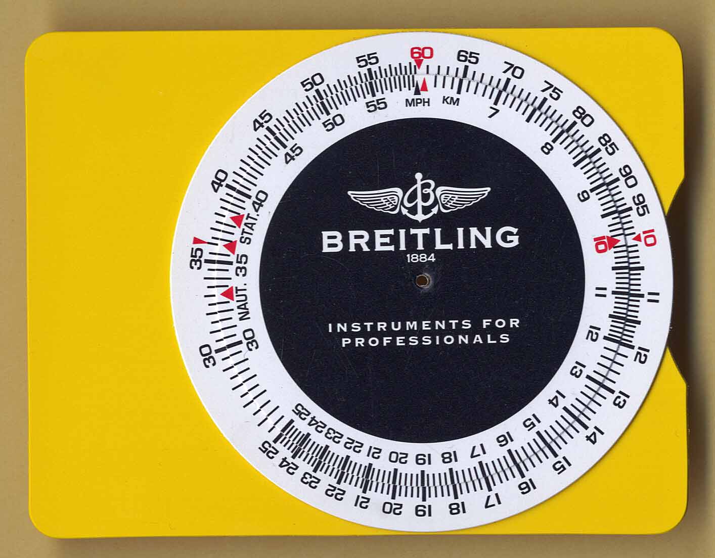 Simple C and D scale for time and speed calculations as an advertisement for Breitling watches.