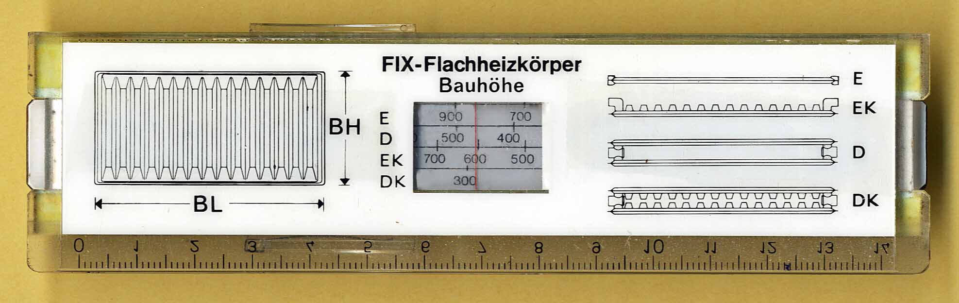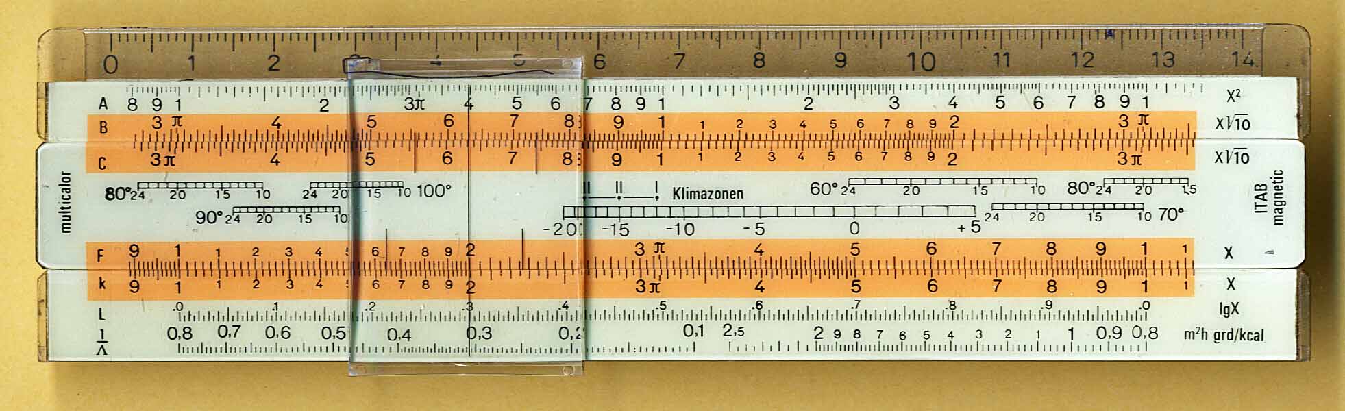 Notes: "1) An interesting slide rule using a rectangular channel for the slide with the slide held in by magnets 2) Four ITAB models were producted, this one apparently for radiator design. 3) Reference Peter Holland, 'Magnetic"" Slide Rules by ITAB, IM2006, Grefswald, 29.9 2006 4) Note the window on the reverse for additional scales on the back of the slide."
