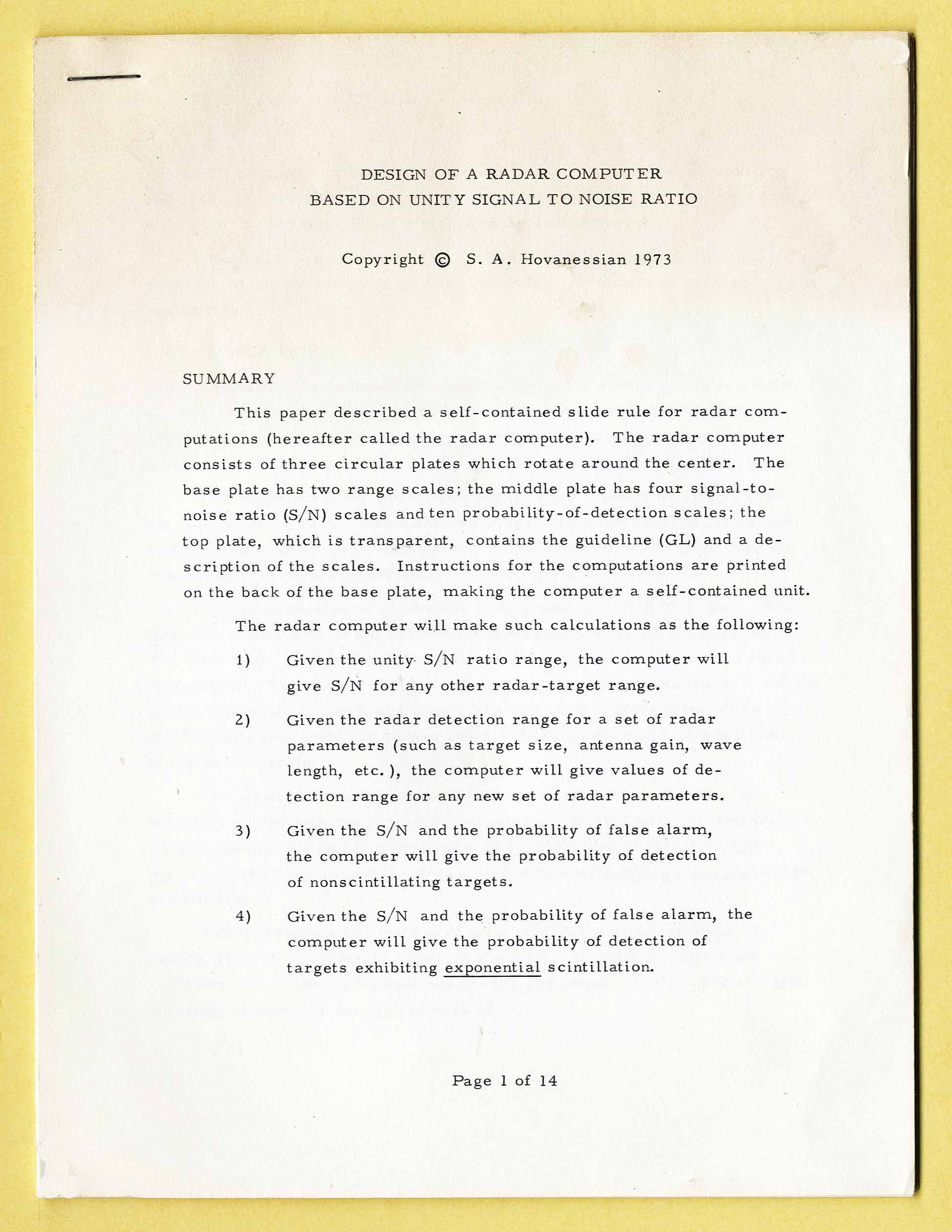 "Used to calculate probability of detection vs distance, signal to notise ratio, target size, antenna gain, wave length etc."