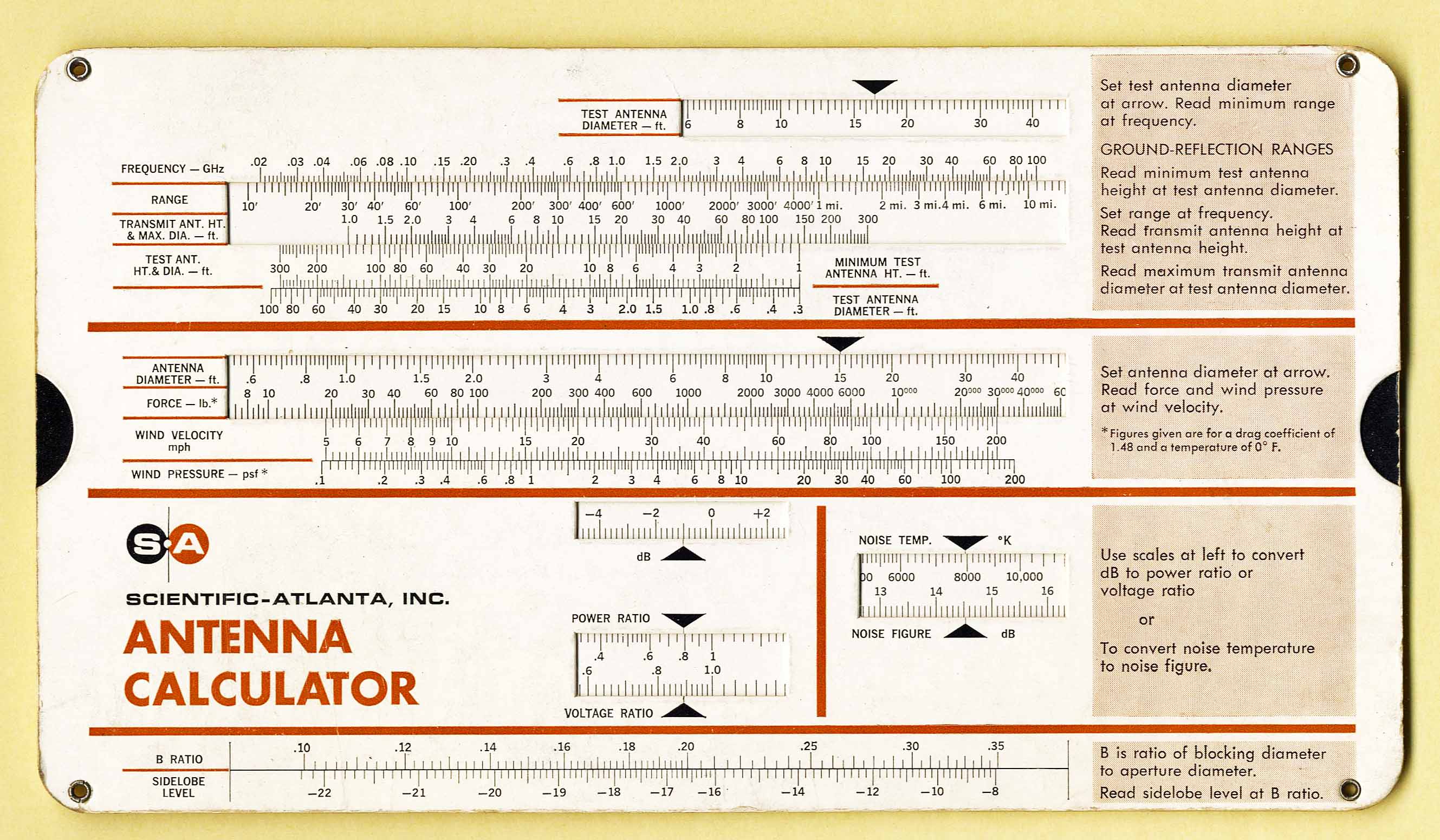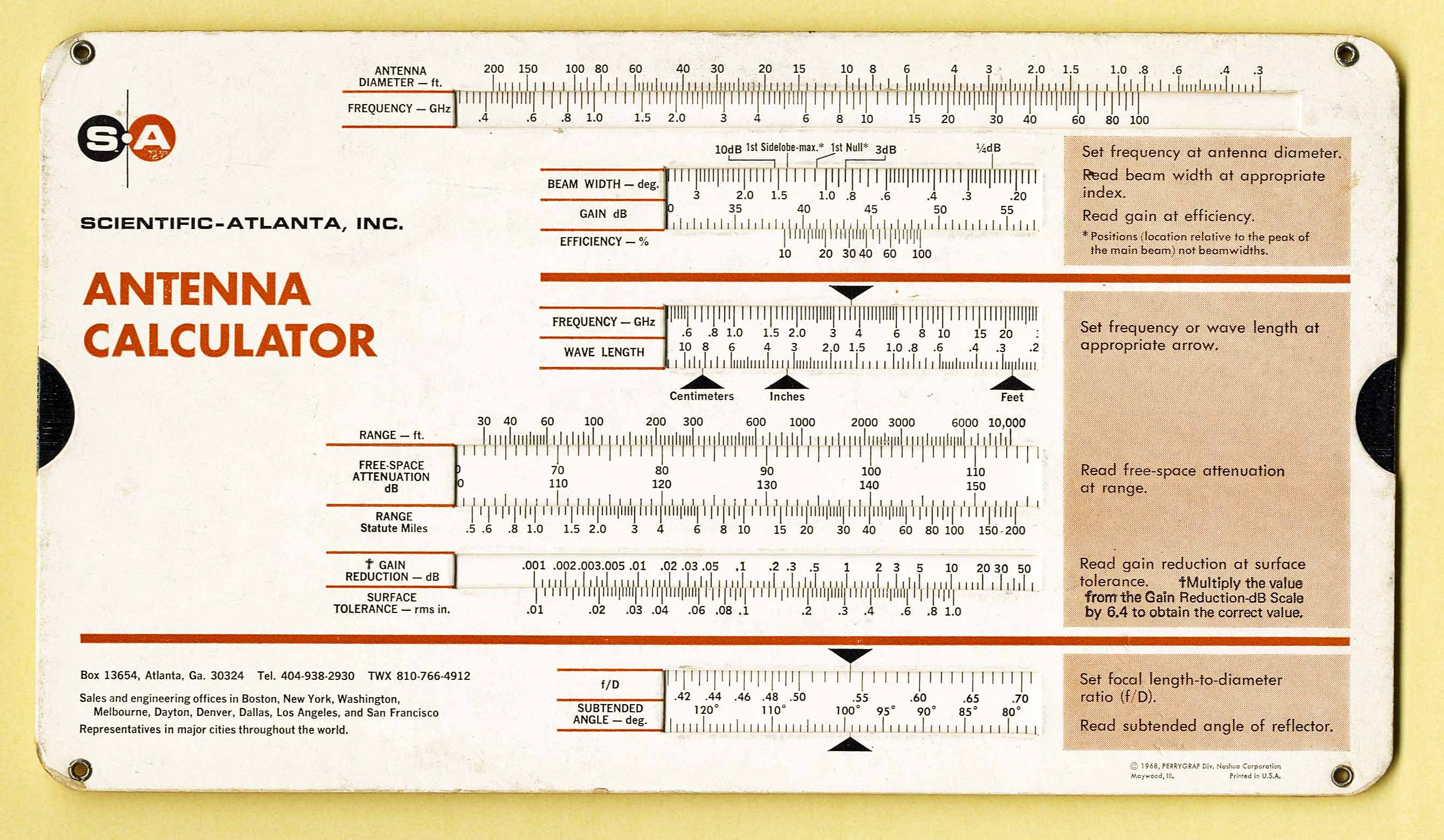 "Used to calculate antenna parameters such a diameter, beam width, gain, frequency, attenuation, etc."