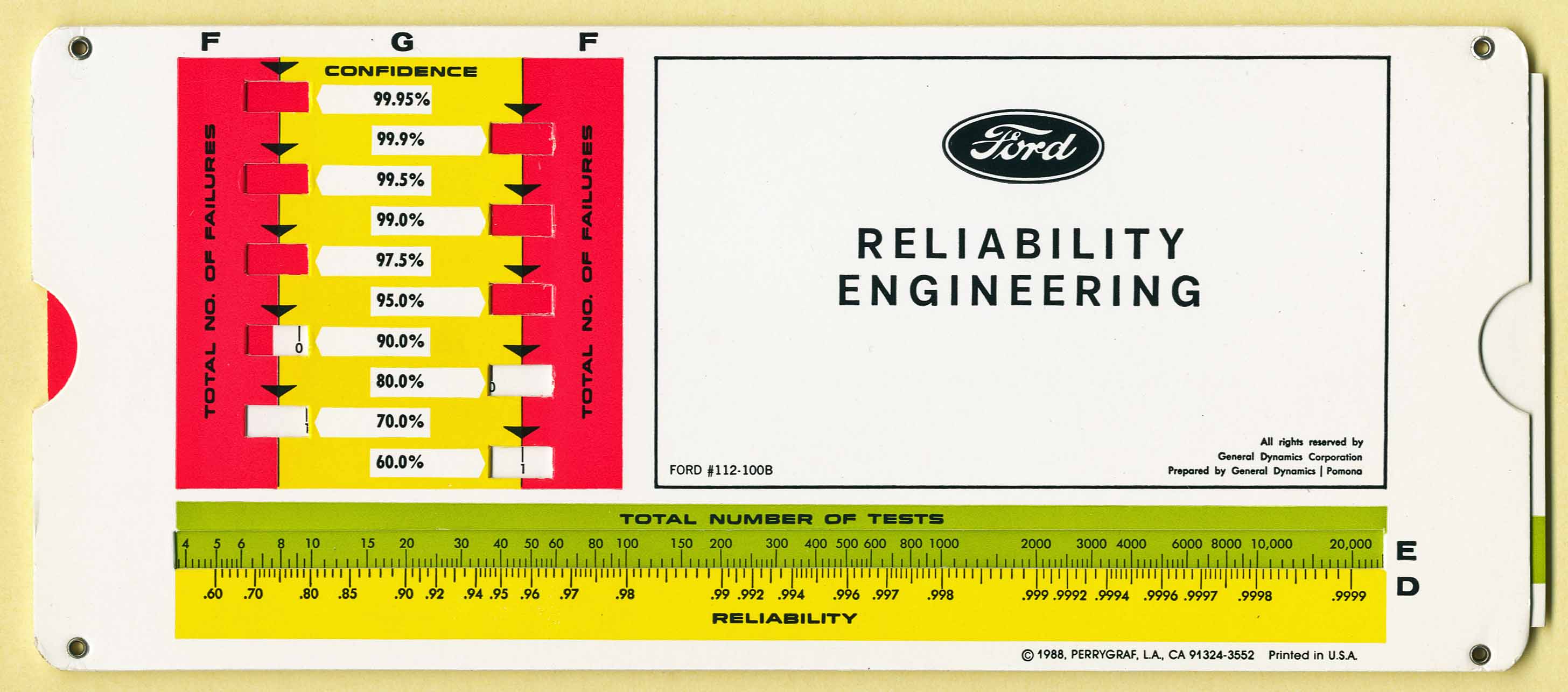 Notes: 1) Used to calculate reliability confidence based on the number of tests and the number of failures 2) Revere side is used to calculate total reliability of the system based on the reliability of the subsystems. 3) Note the slide rule was prepared by General Dynamics Corporation