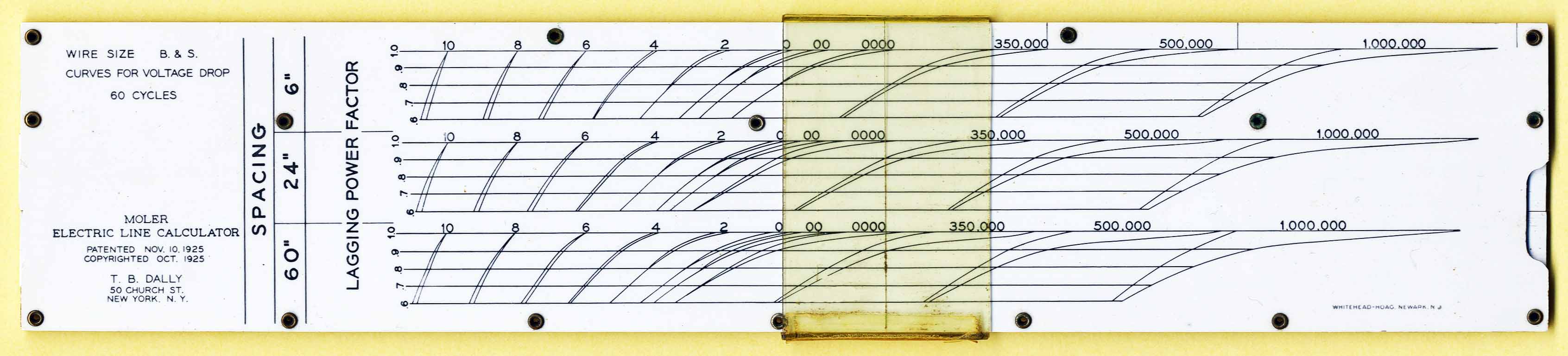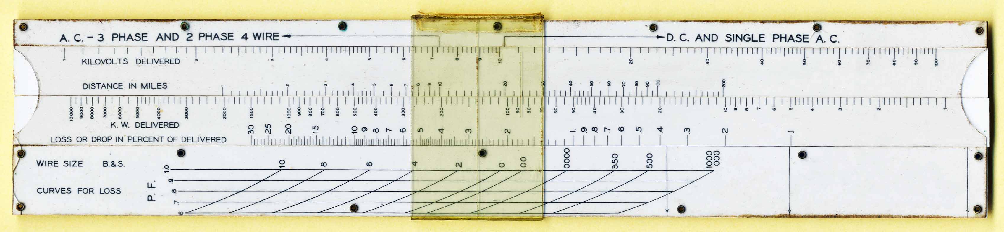1) Used to calculate line loss and power factor for 60 cycle electrical distribution lines 2) Slide rule has 2 slides