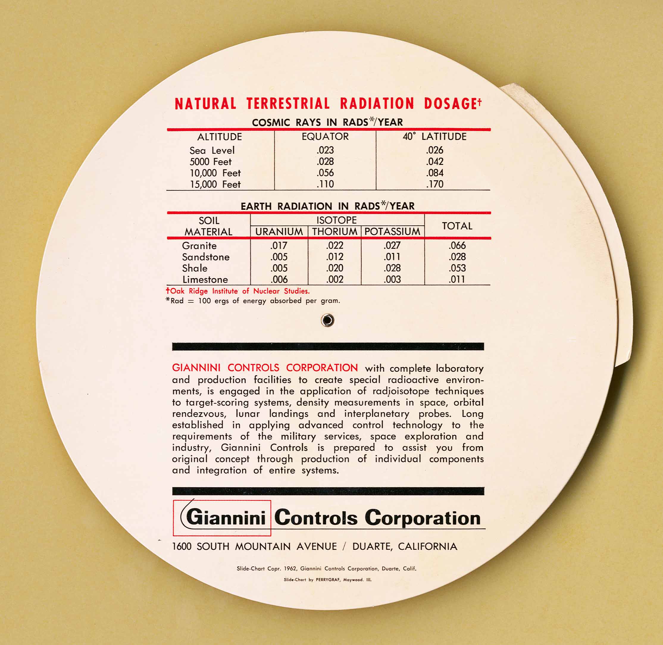 "1) Made for Giannini Controls Corp. 2) Cosmic Ray Dosage and dosage from Granite, Sandstone, Shale and Linestone"