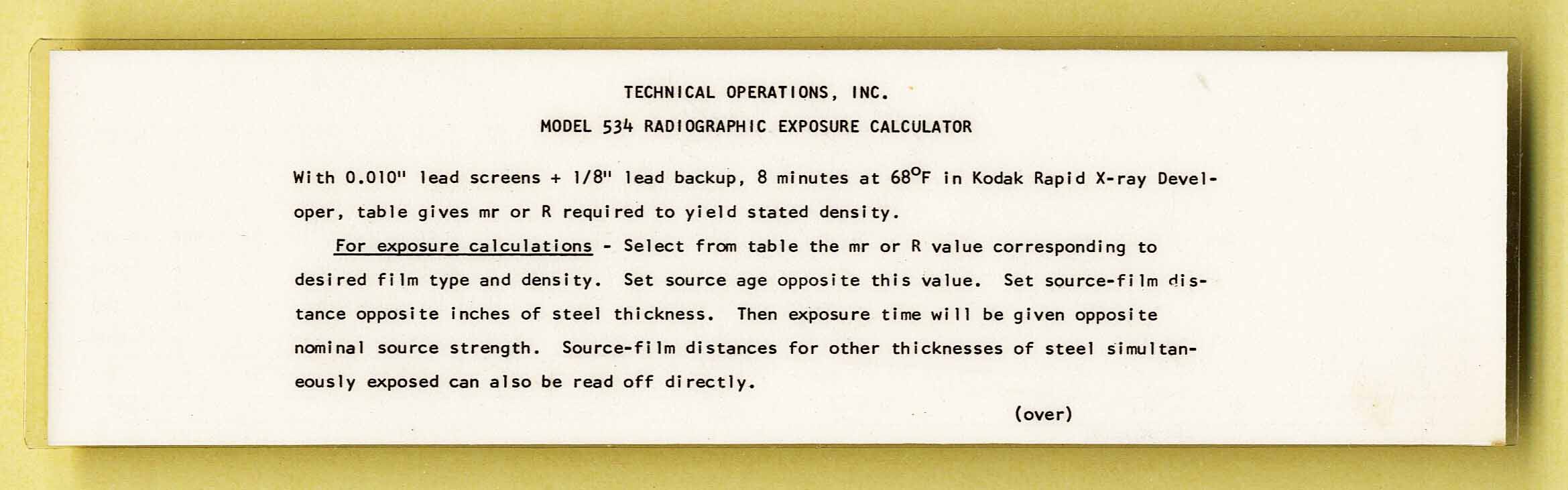 Notes: 1) Used to predict film exposure times for Iridium on the front side 2) Used to predict exposure times for Cobalt on the reverse side of one of the slides 3) Note - thesingle sided slide rule has 2 slides 4) Made by an unknown company in Denmark for Tech Ops in the USA