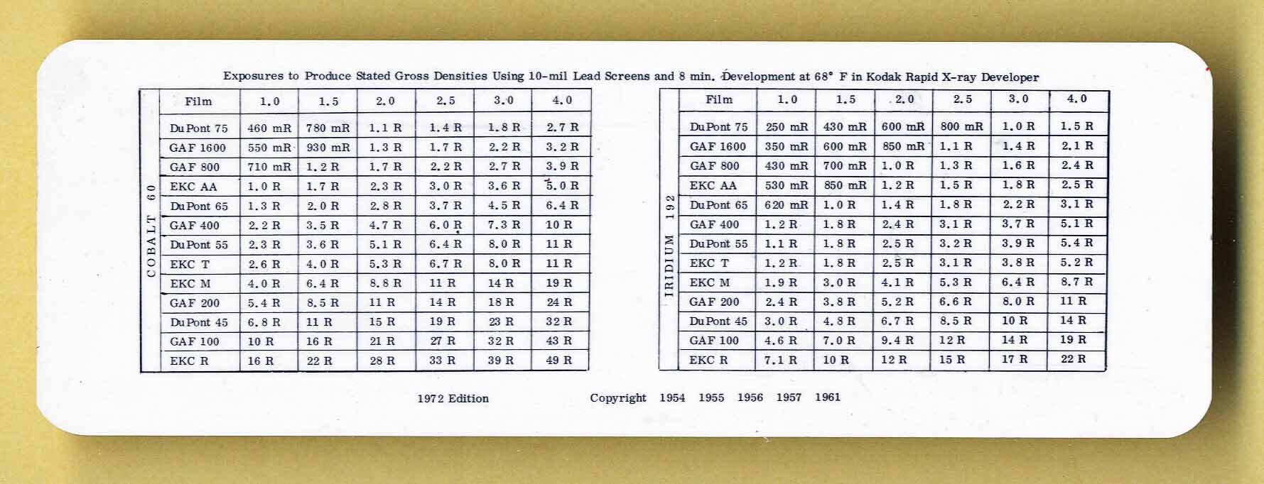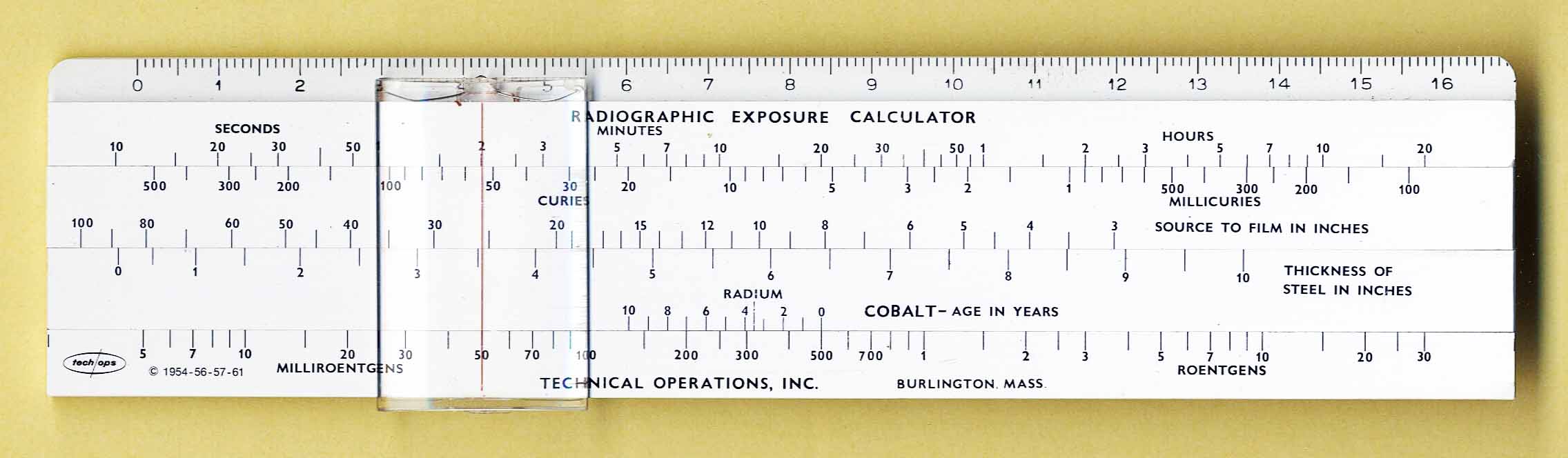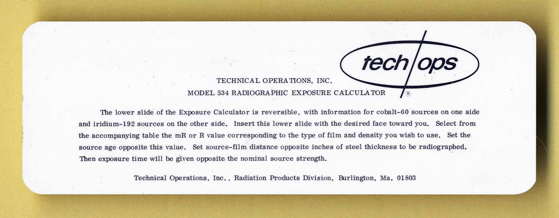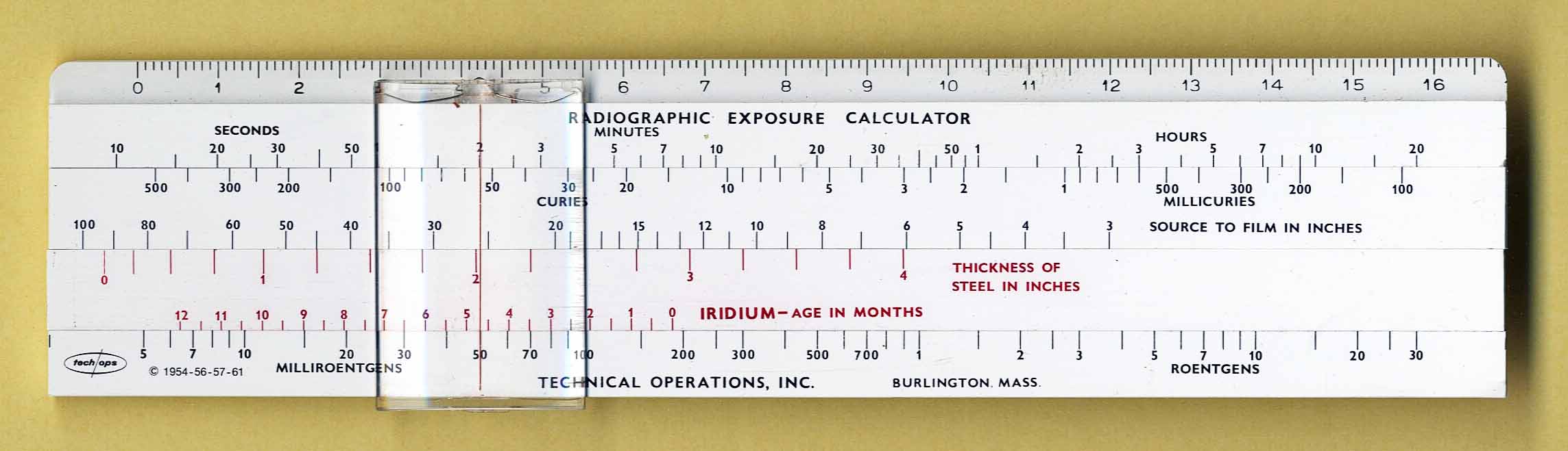 Notes: 1) Used to predict film exposure times for Iridium on the front side 2) Used to predict exposure times for Cobalt on the reverse side of one of the slides 3) Note - the single sided slide rule has 2 slides 4) Made by an unknown company in Denmark for Tech Ops in the USA