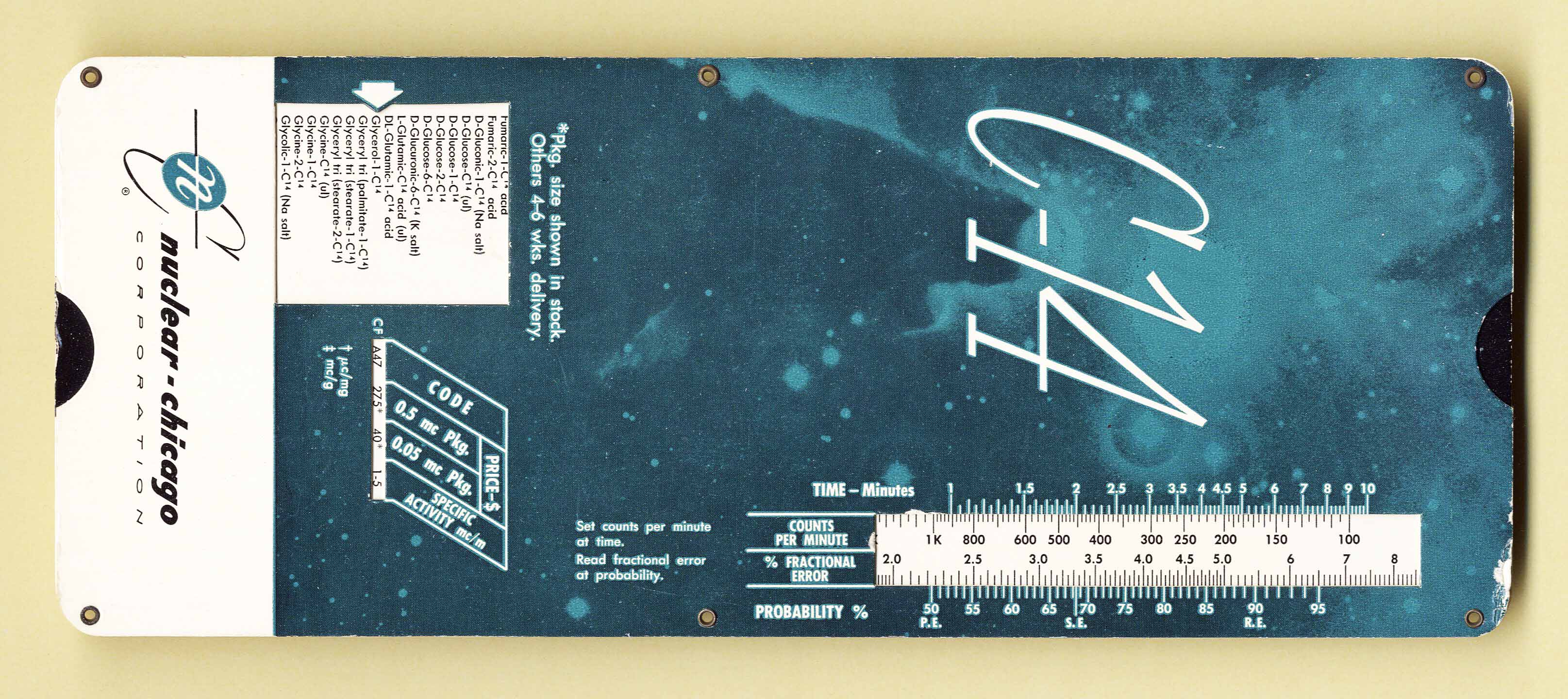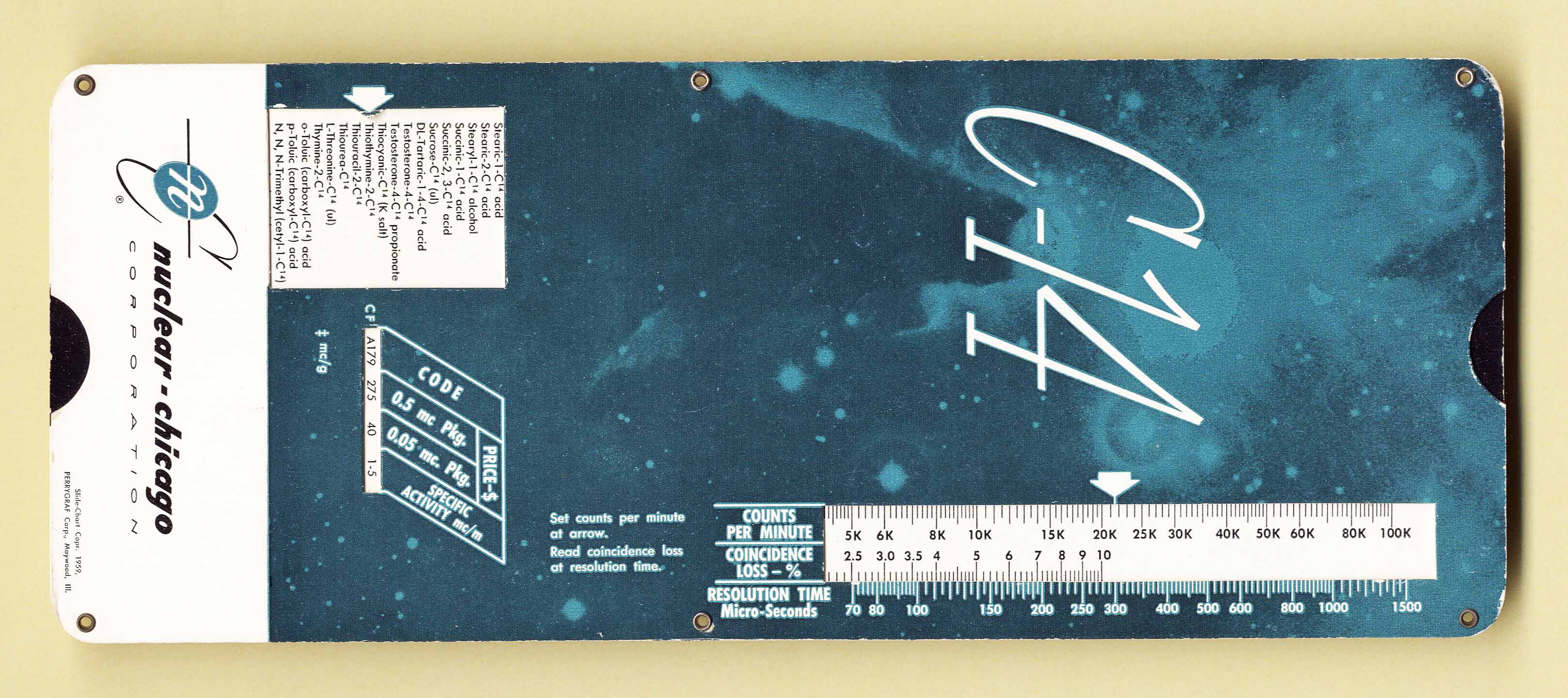 1) Contained an extensive list of carbon 14 containing compounds supplied by Nuclear Chicago 2) Provided counts per minute and resolution time 3) Manufactured by Perrygraf for Nuclear Chicago