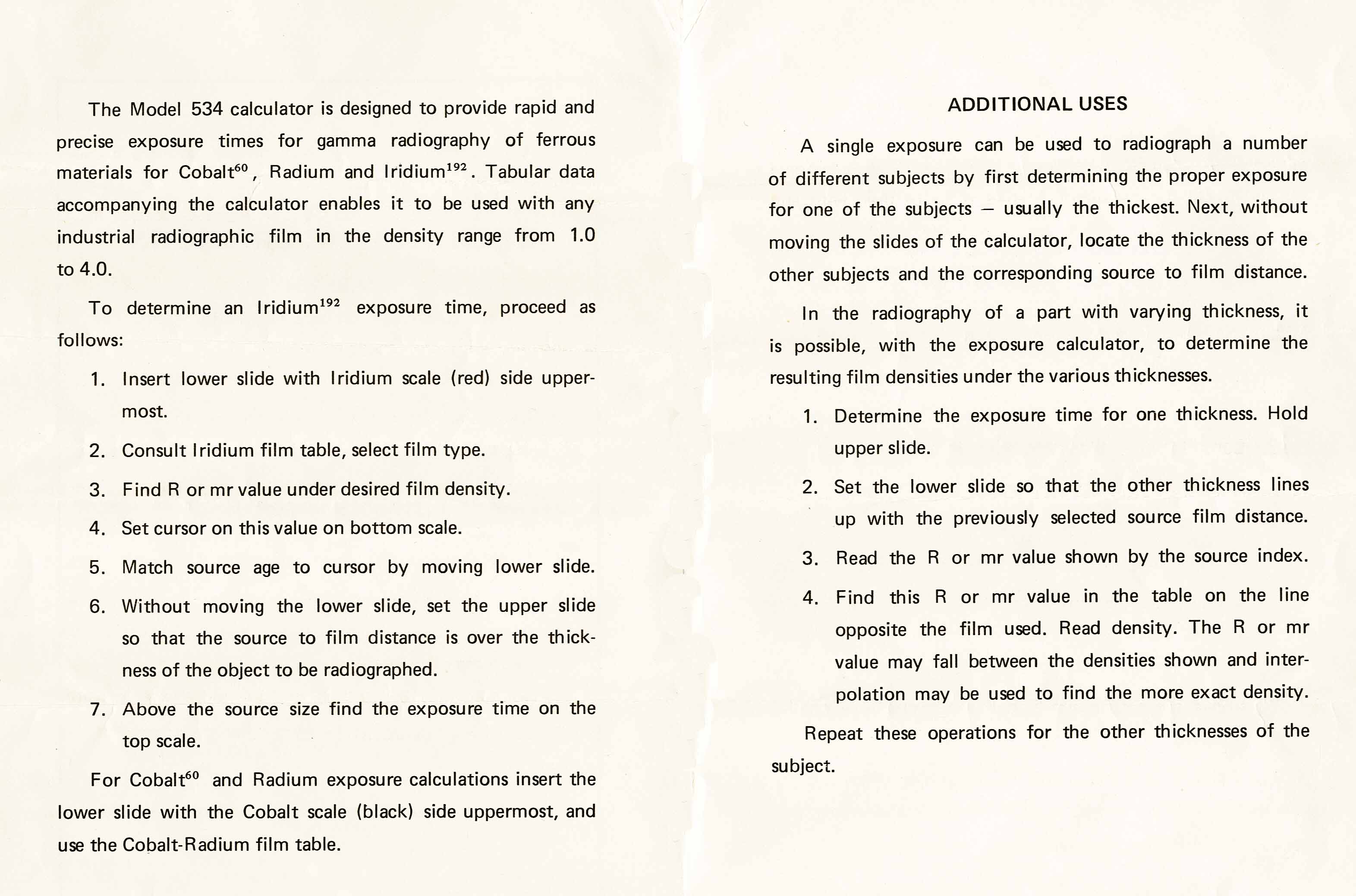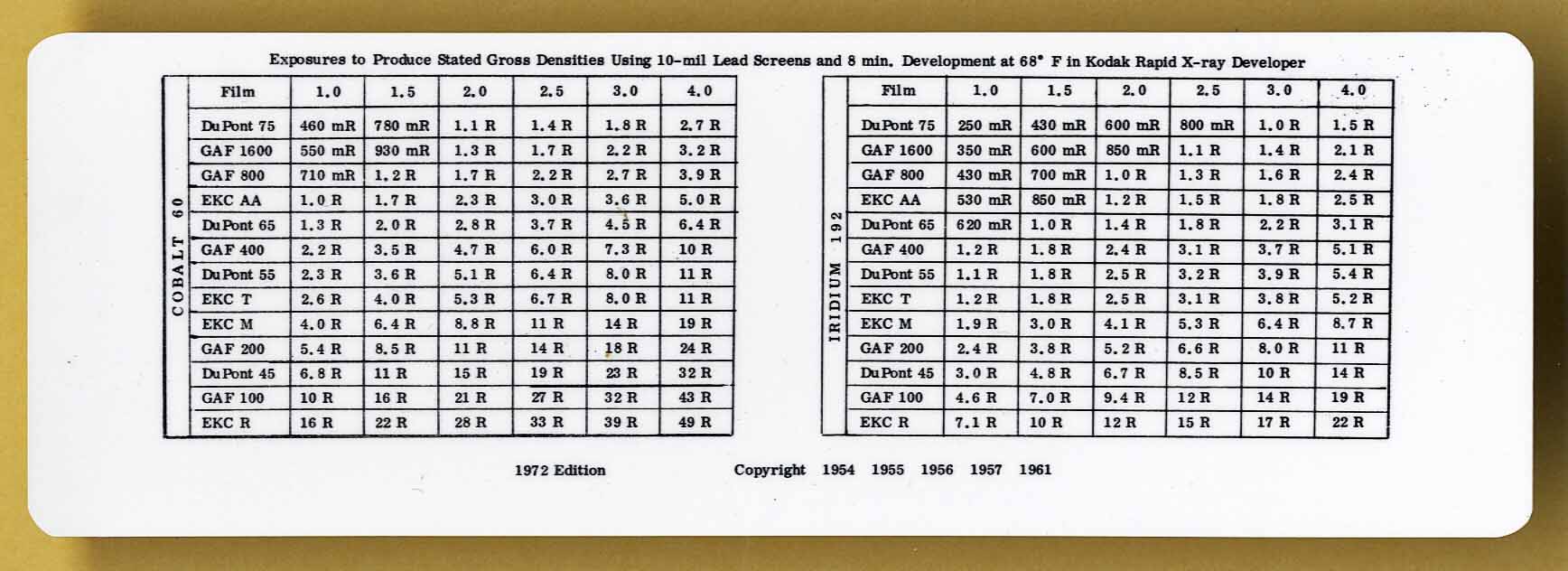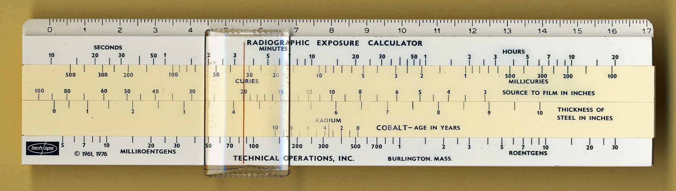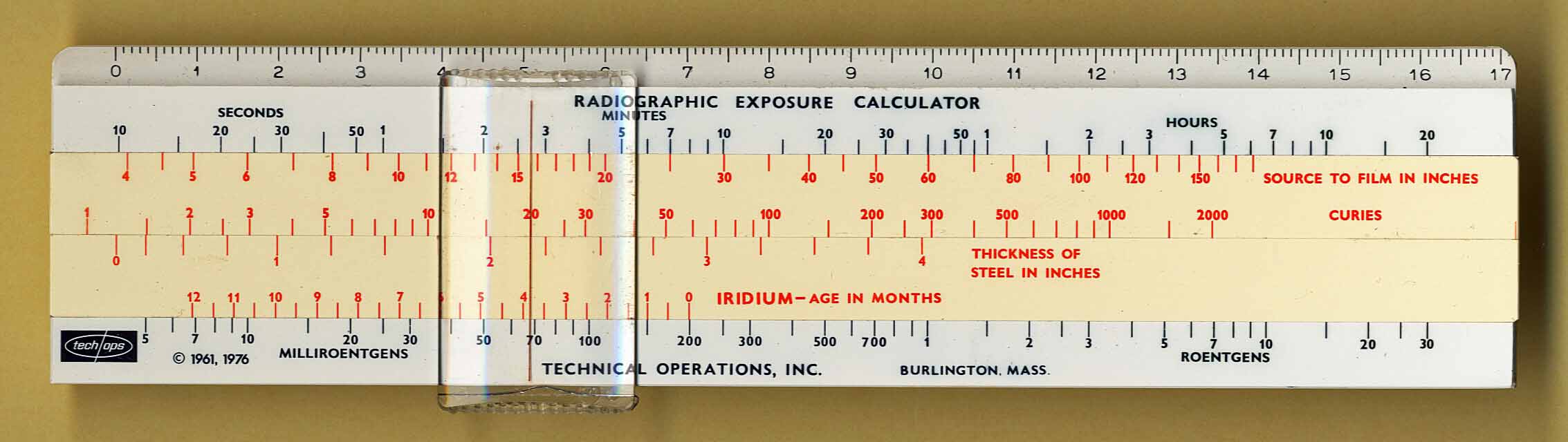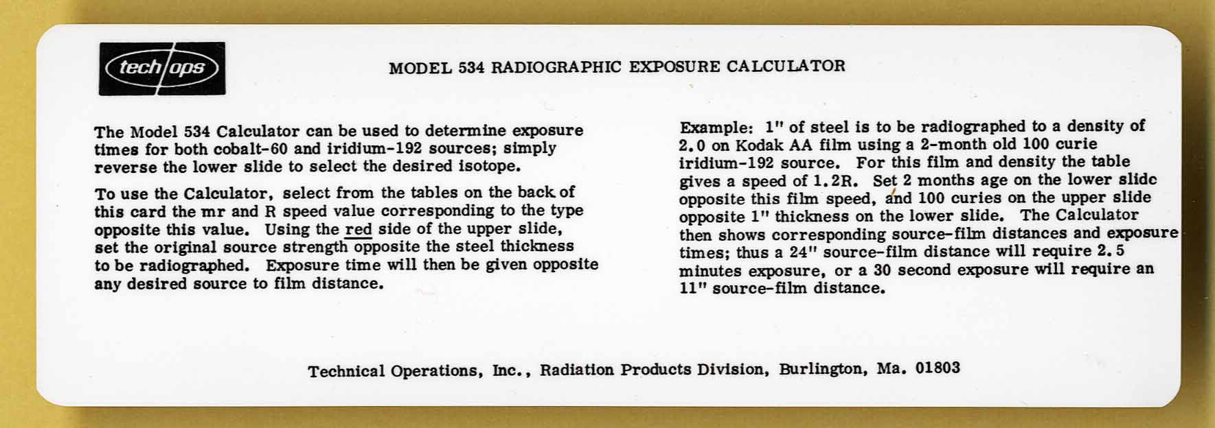 Notes: 1) Used to predict film exposure times for Iridium on the front side 2) Used to predict exposure times for Cobalt on the reverse side of one of the slides 3) Note - the single sided slide rule has 2 slides 4) Made by an unknown company in Denmark for Tech Ops in the USA