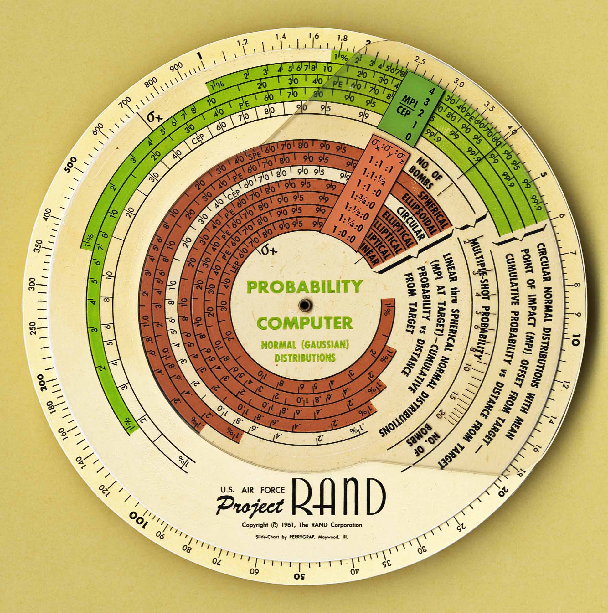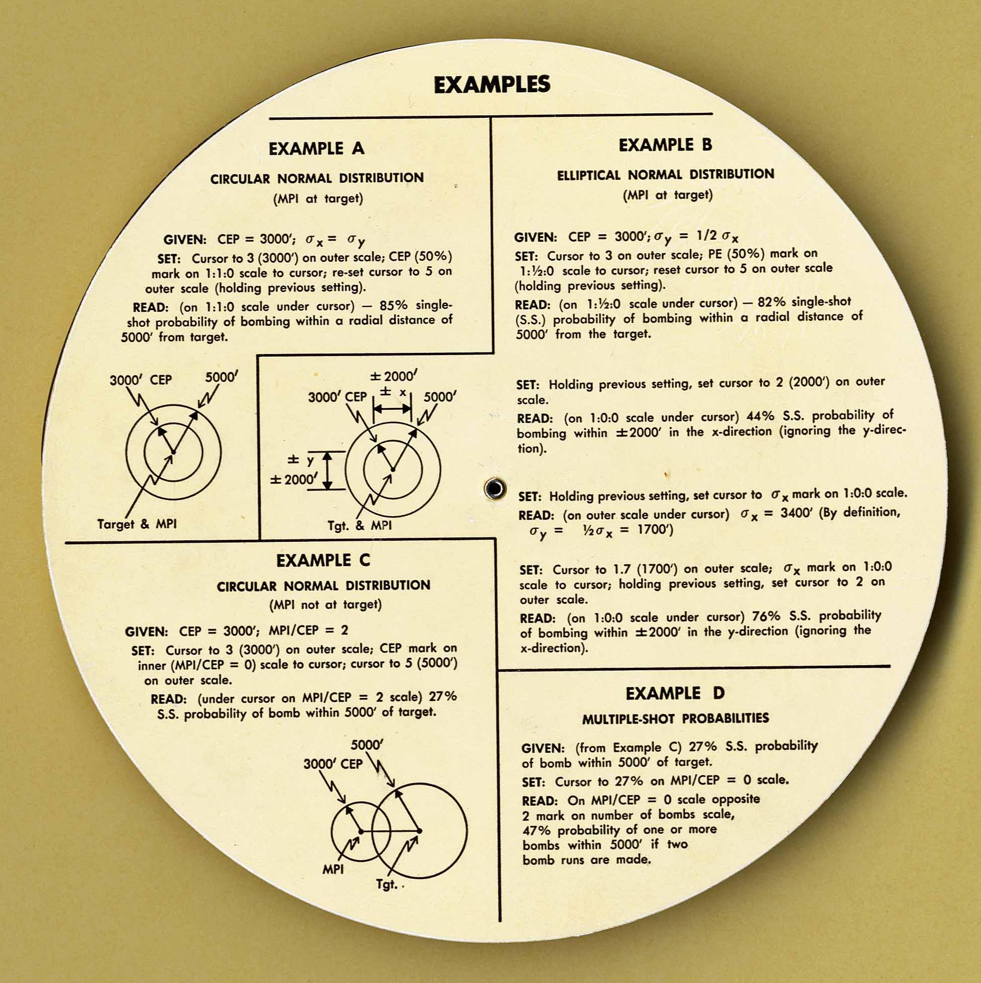 1) A disk slide rule used to calculate the probability of hitting a specific target and the number of bombs needed to guarantee a specific probability. 2) Slide rule has 2 concentric disks and a clear cursor 3) A US Ait Force Project