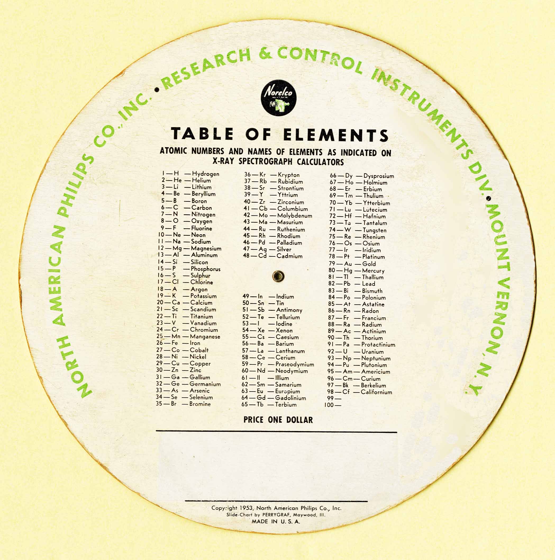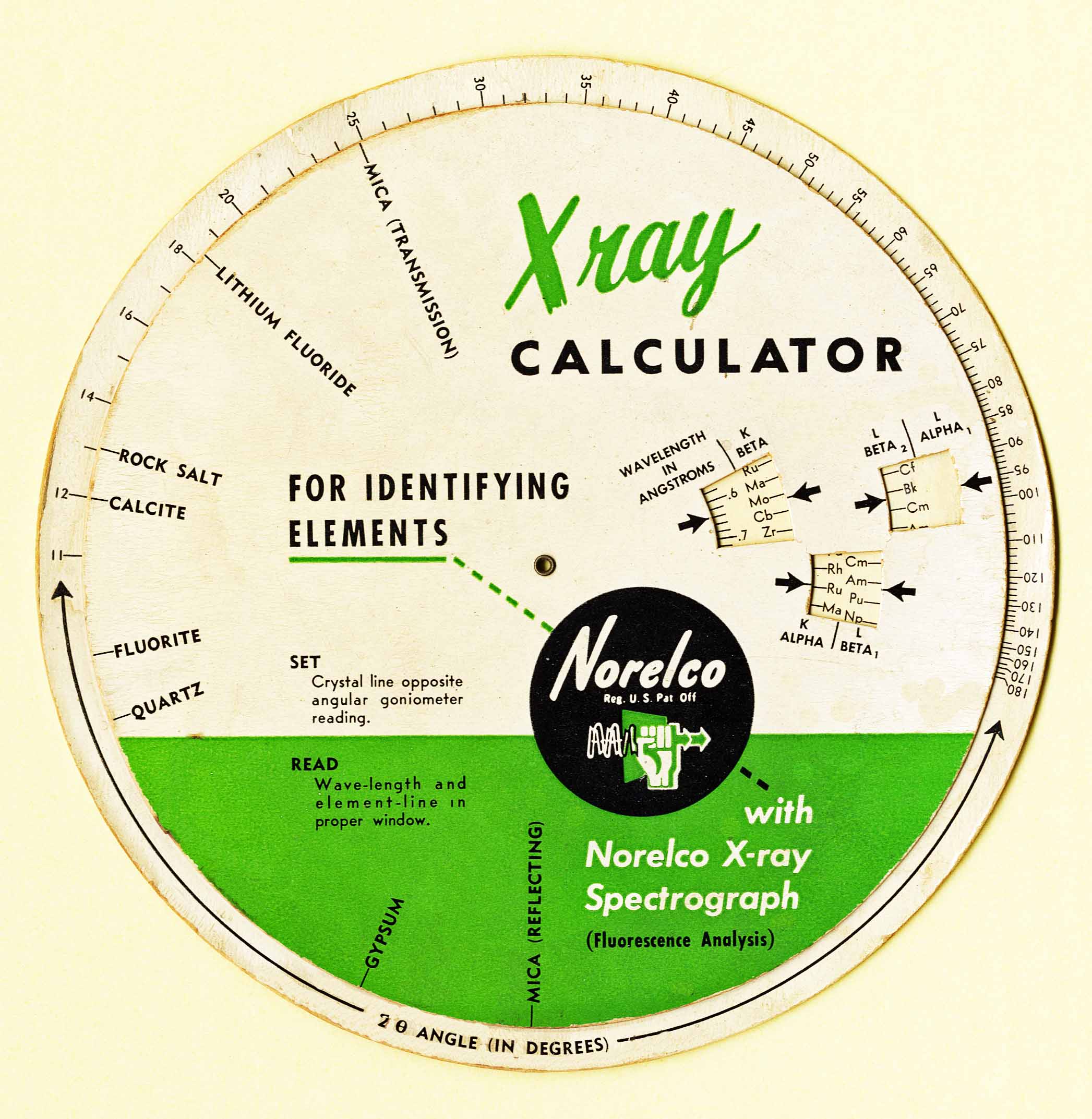 Notes: 1) Used for X-Ray fluorescenct spectrography like the Spectro-Rules above 2) Norelco X-Ray Spectrograph 3) The Norelco name was used on many products sold in the USA by Philips until 1974 4) Note the list of elements on the reverse only goes to element 98.