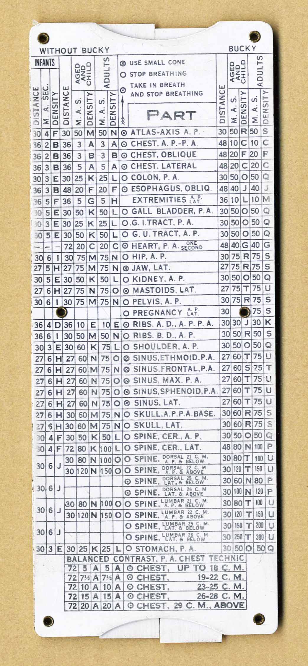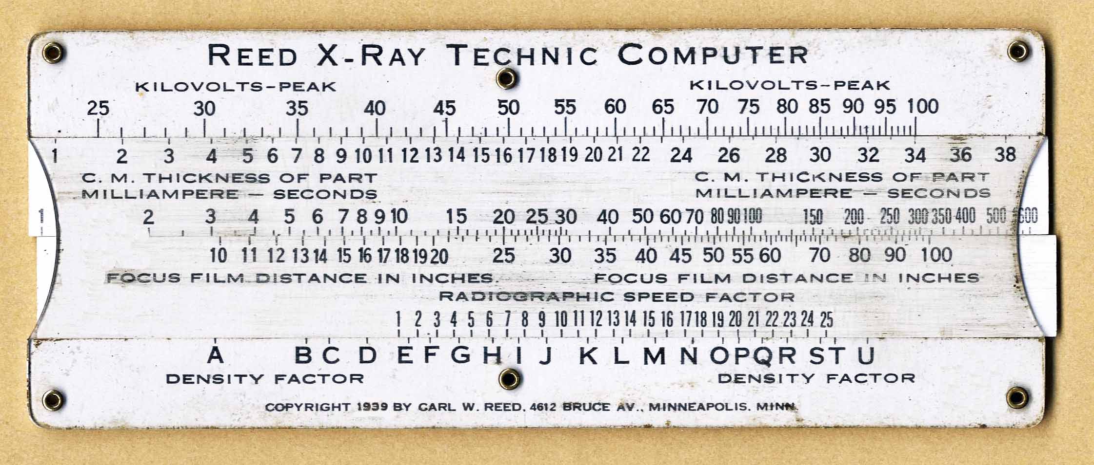 "1) Used to calculate voltage and current for an X-Ray tube to achieve correct film exposure 2) Note the rule has 2 slides 3) The reverside side has tables for various body parts, dimensions and patient age"