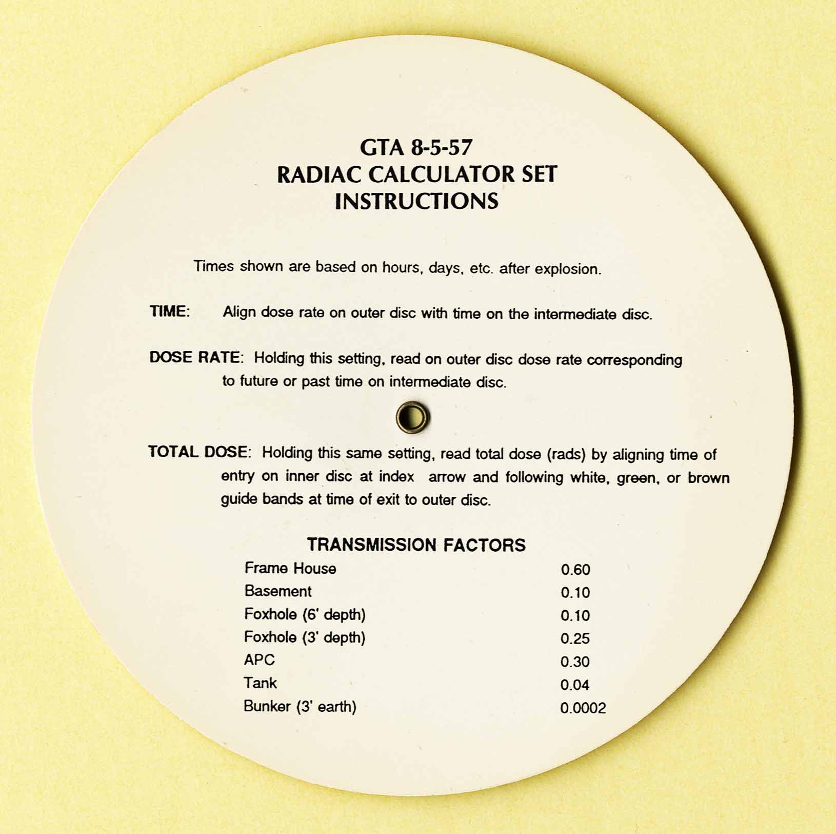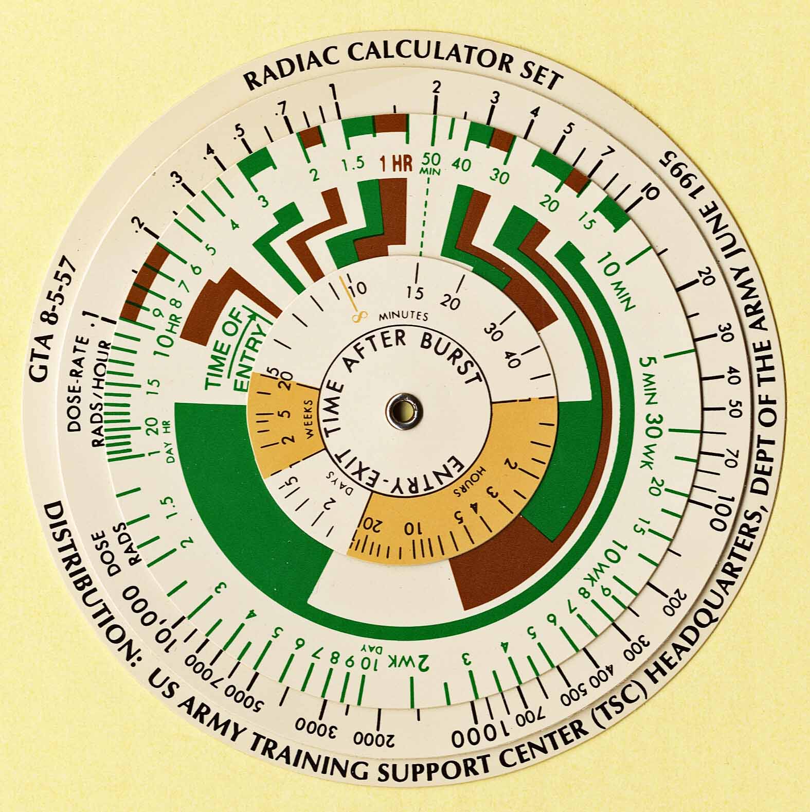 1) Used to calculate safe entry and exit times after an atomic blast 2) Note that his slide rule has 4 concentric disks