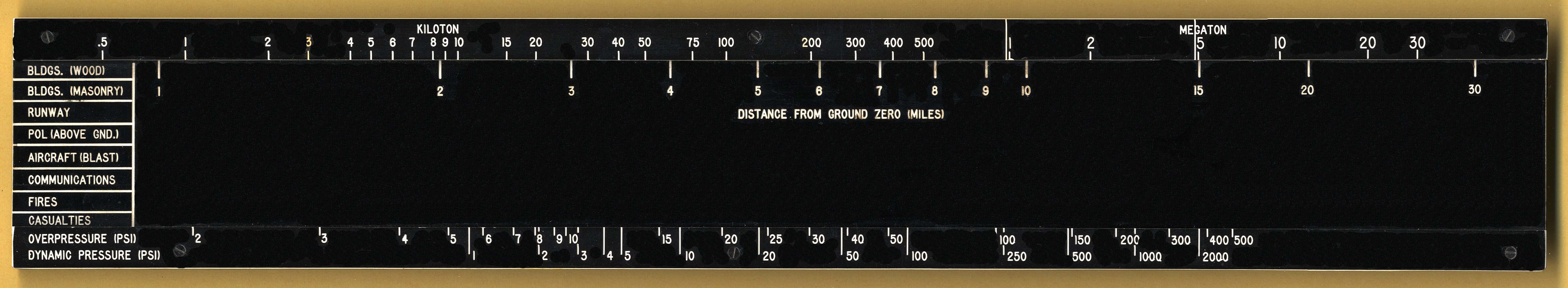 1) Used to show expected bomb damage versus bomb strength on various structures & equipment 2) This one includes scales up to 30 Megaton strength 3) An interesting rule with an unknown maker