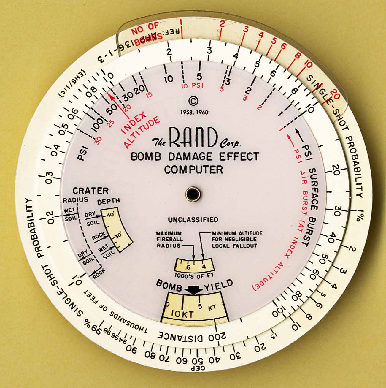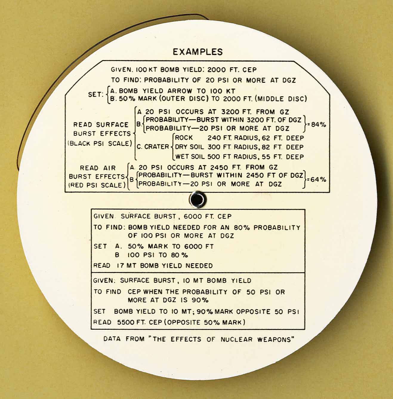 "1) Has 3 concentric disks with a clear cursor. 2) Early model of the previous one shown 3) Used to predict bomb damage based on data from ""The Effects of Nuclear Weapons"" "