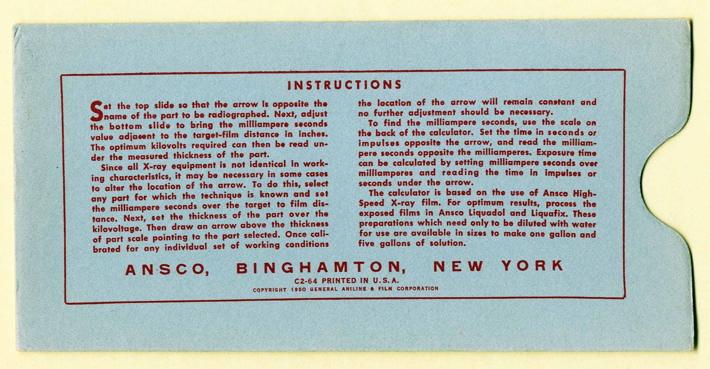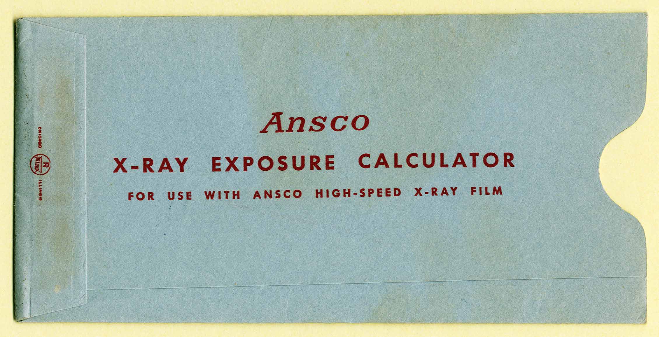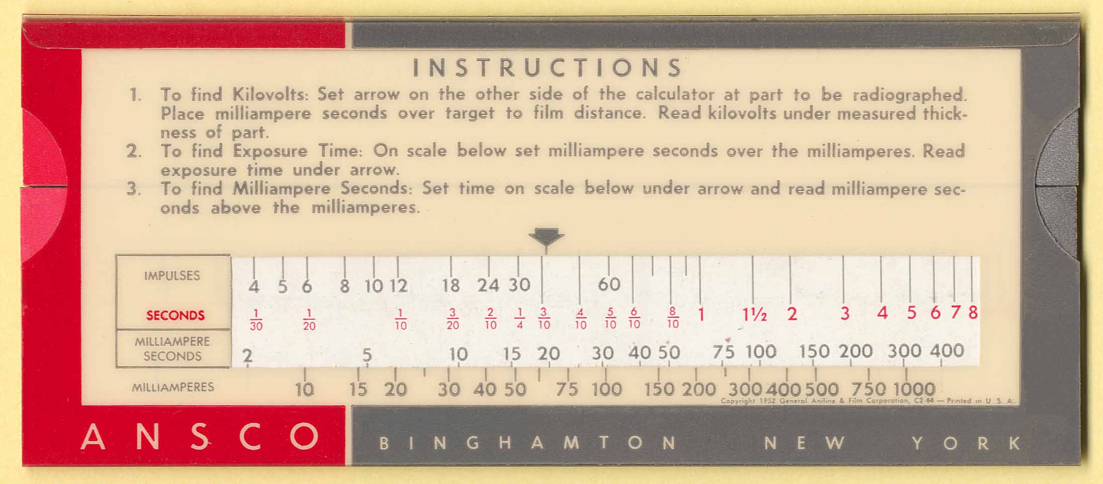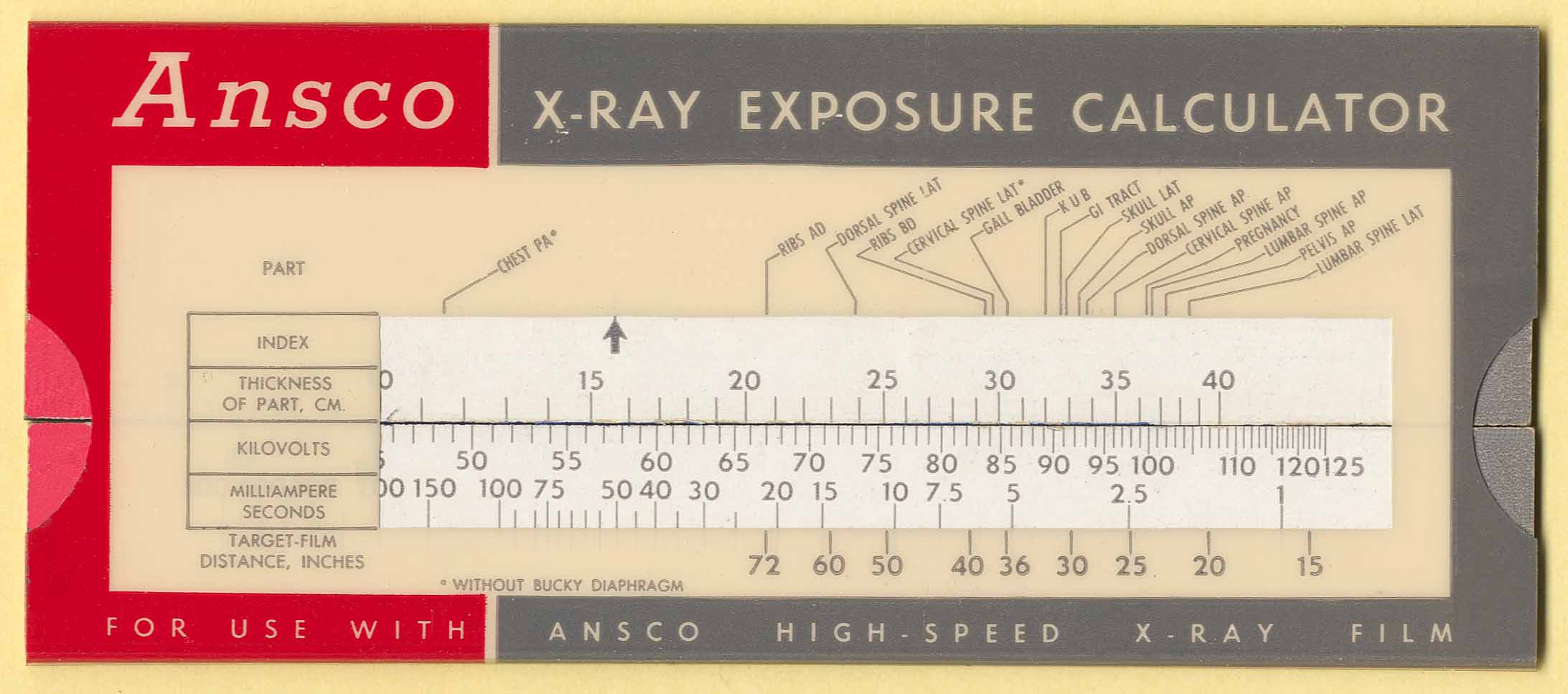 1) Used to calculate exposure settings for high speed X-Ray film 2) Used specifically for medical imaging 3) This slide rule has 2 slides