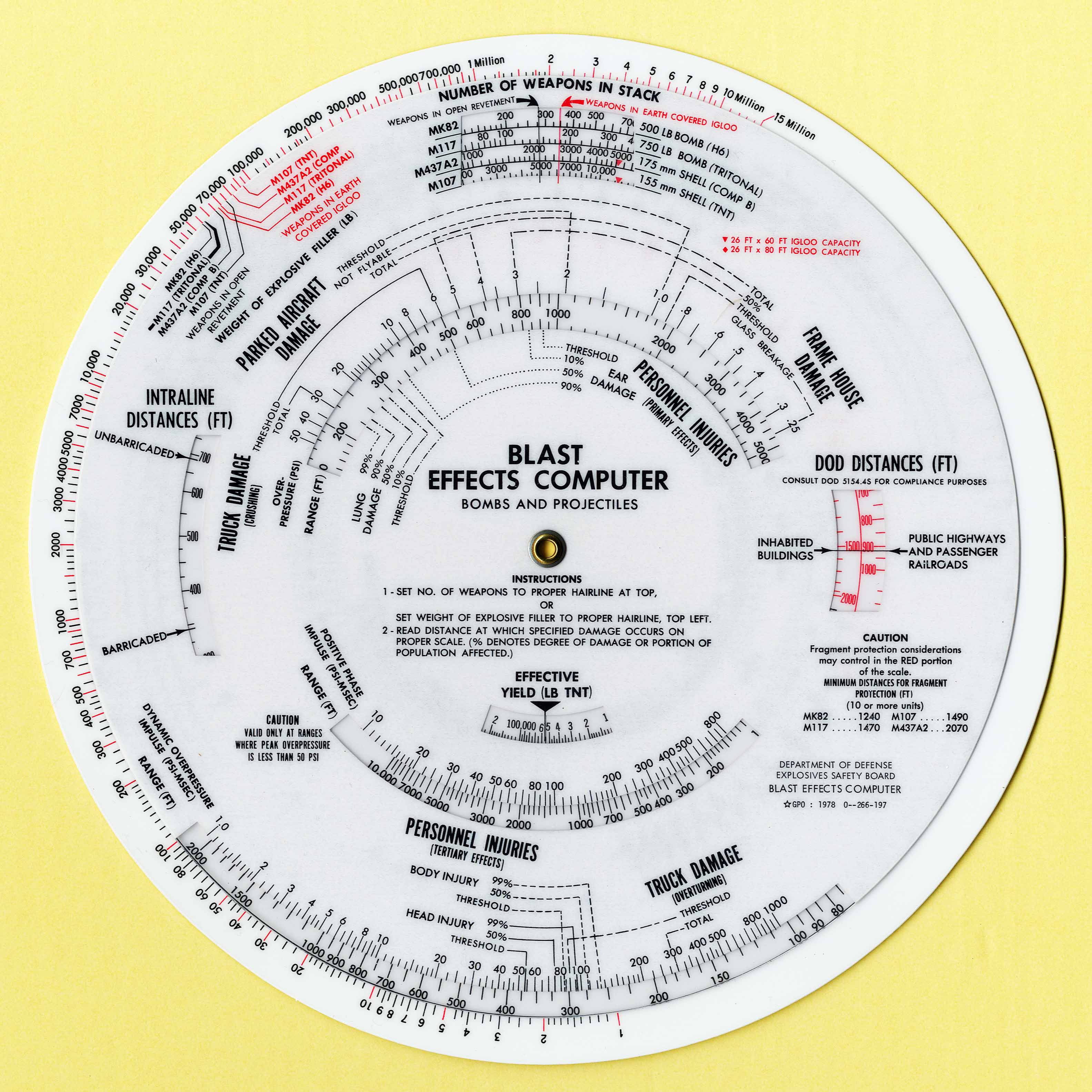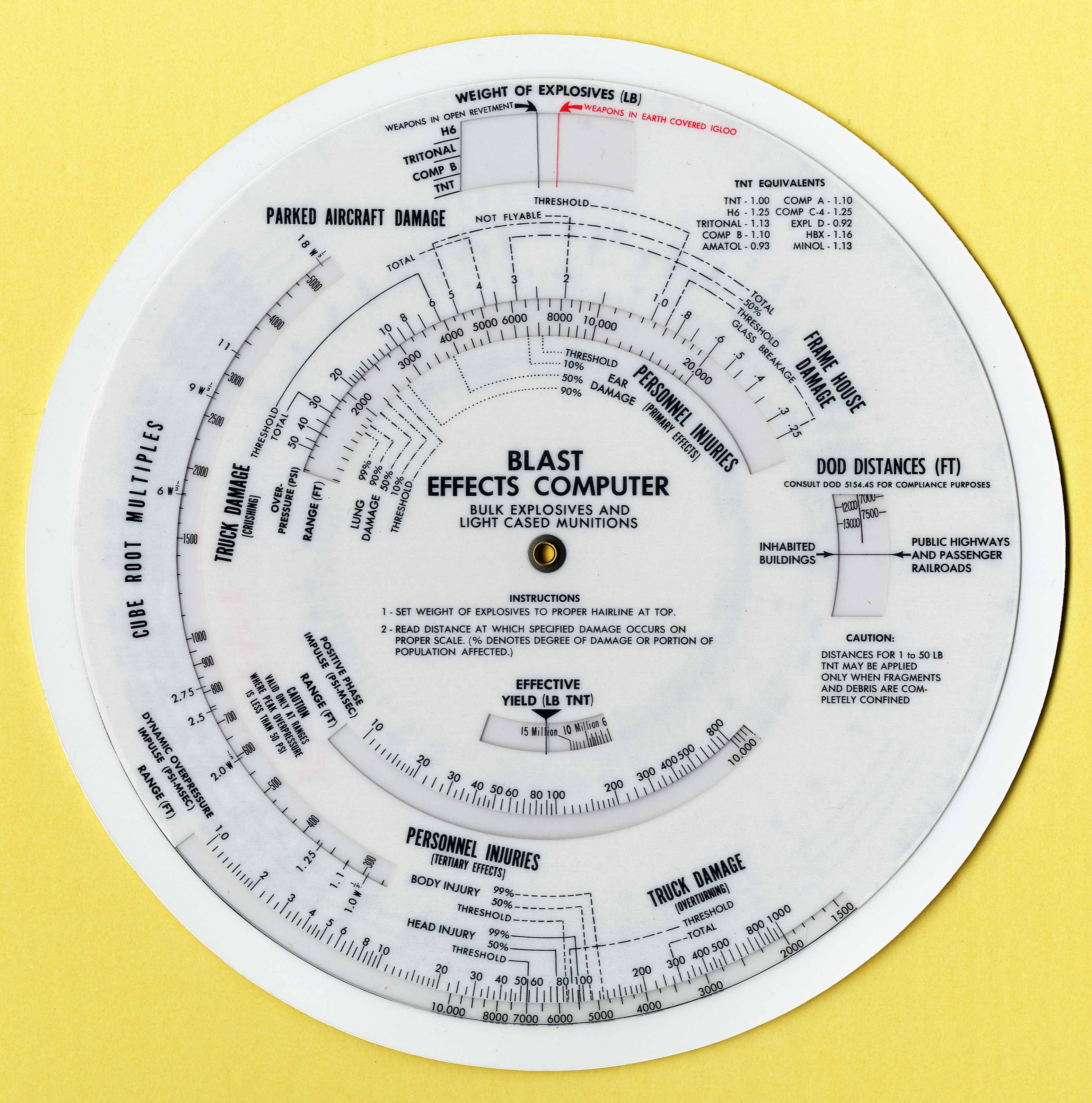 1) Used to predict damage from bombs and projectiles 2) Included an instruction manual 3) Included yield scale in pounds of TNT as well as lists of various conventional weapons