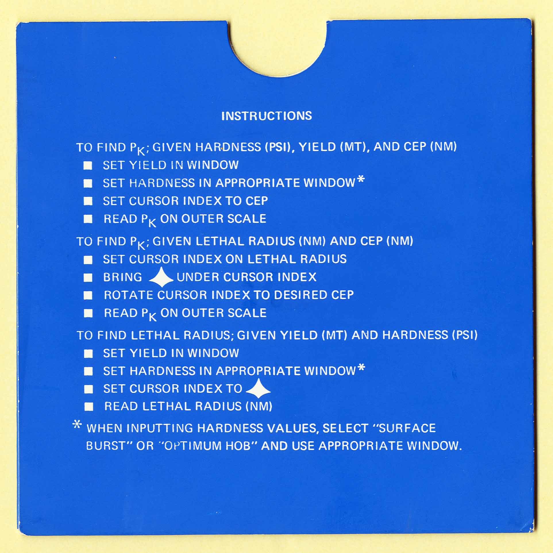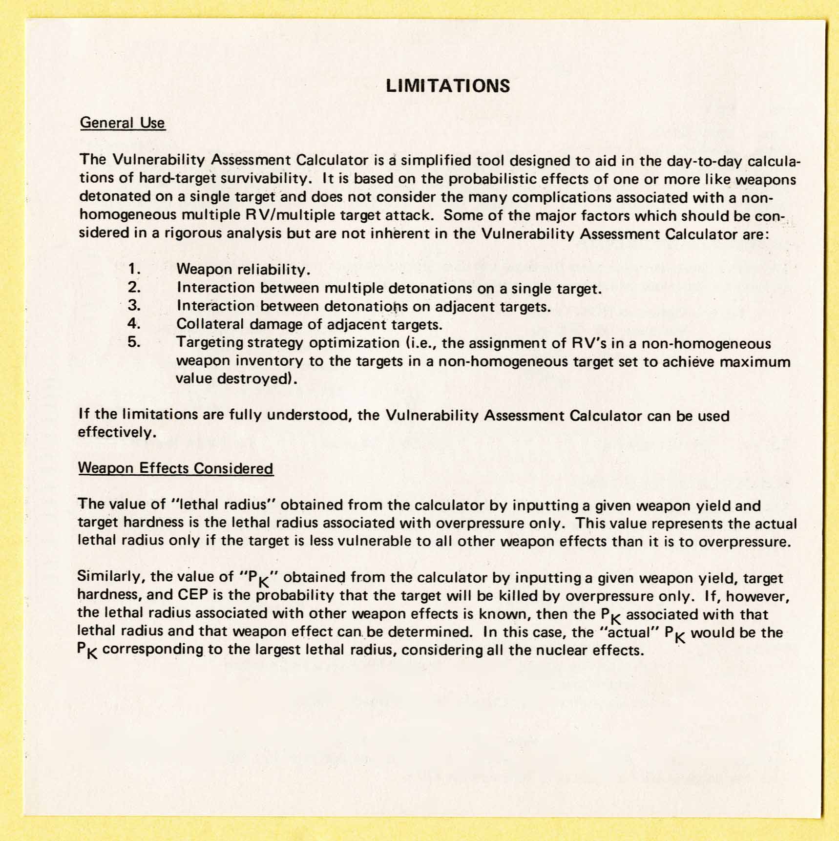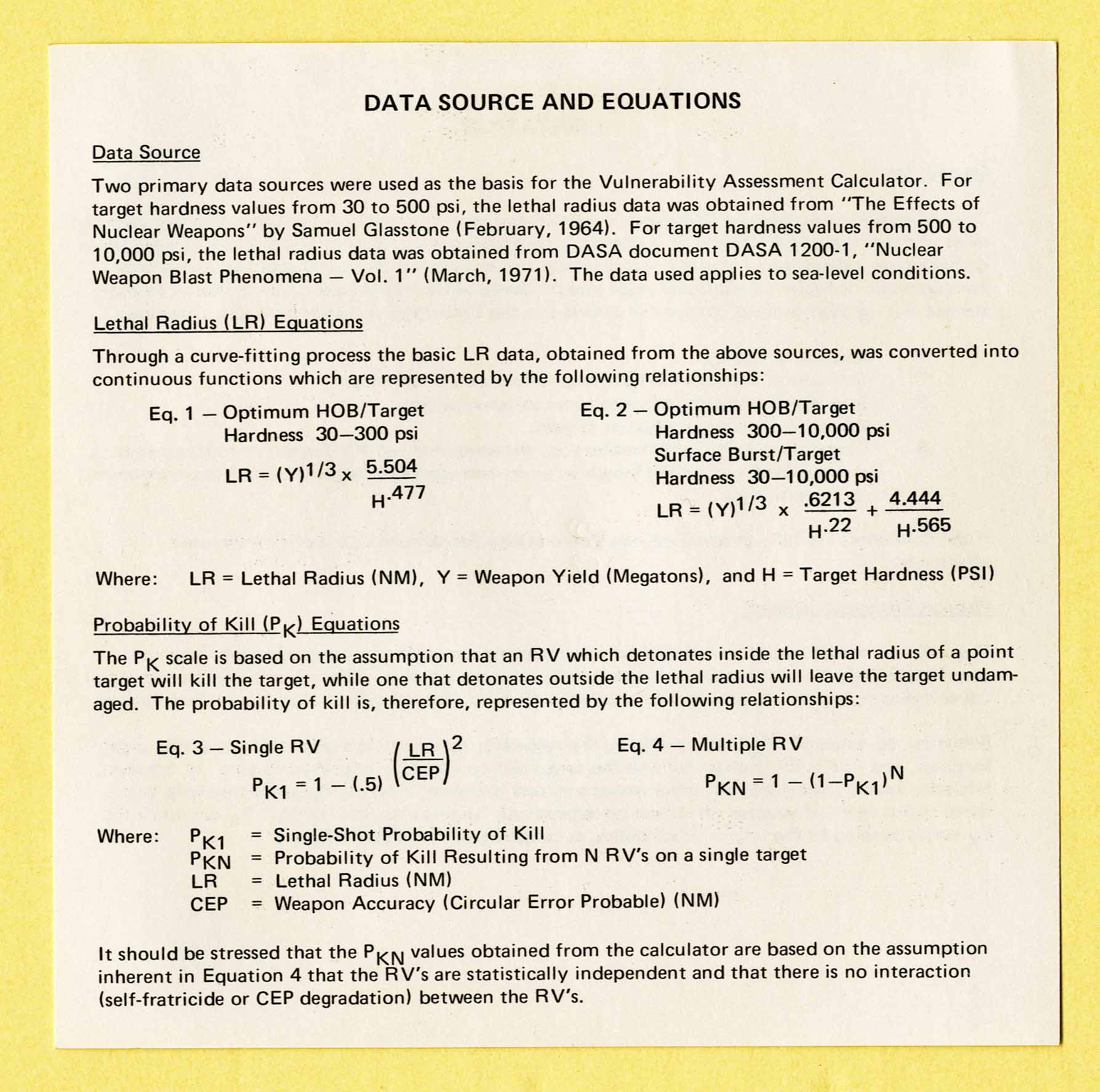 1) Used to compute the vulnerability of a target to over pressure from a nearby nuclear blast given the estimated yield. 2) One computation output included lethal radius in nautical miles