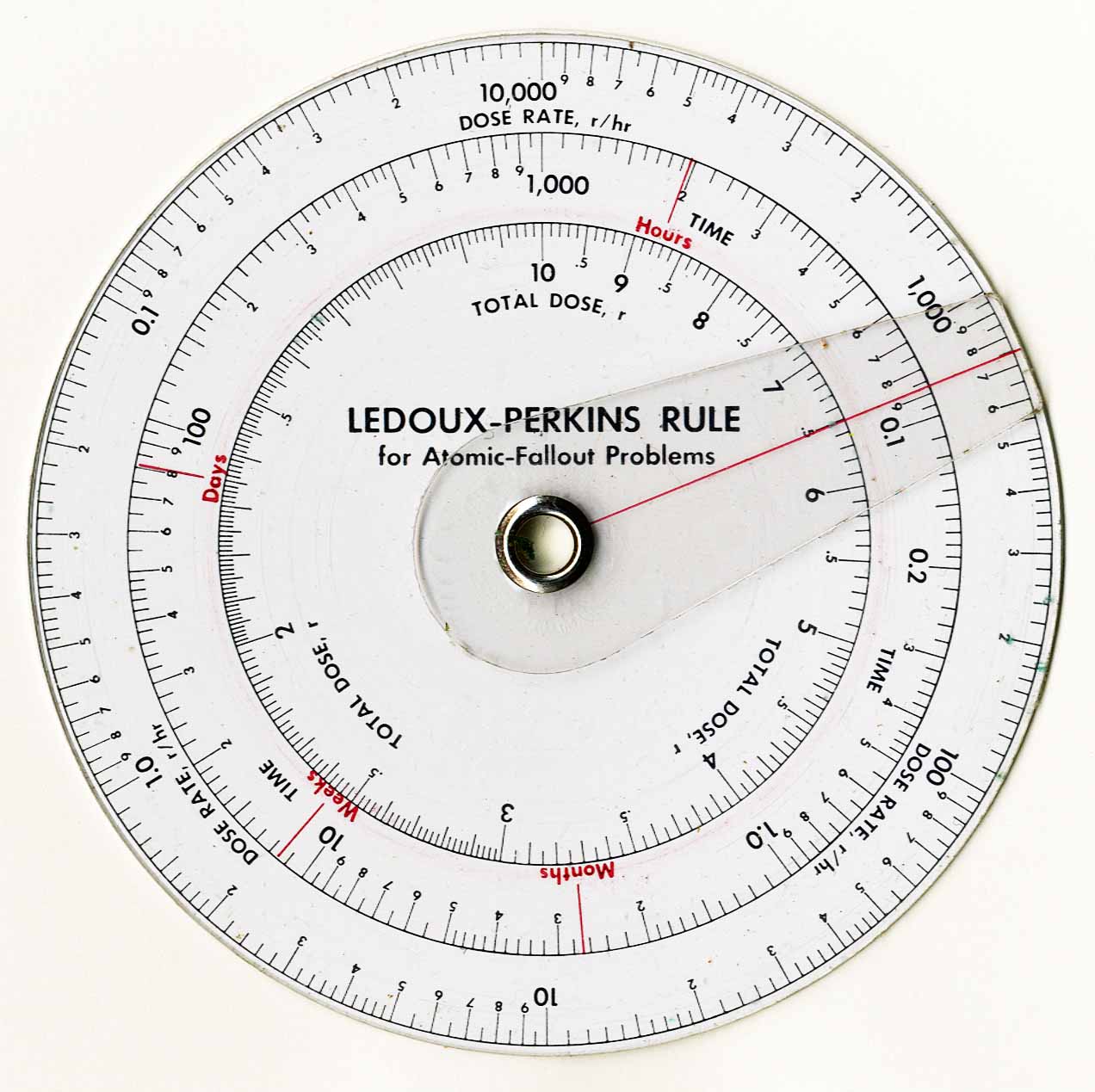 Notes: "1) Used to calculate atomic fallout dose calculations 2) An interesting calculator designed by LCDR J.C. LeDOUX & LCDR A.C. Perkins, US Navy Base Port Hueneme, CA in 1959 3) No manufacturer listed - apparently designed and built by these two Navy Lieutenant Commanders 4) ""Radiation Slide Rule For Passive Defense Problems"" published in The Military Engineer, July-August 1959."