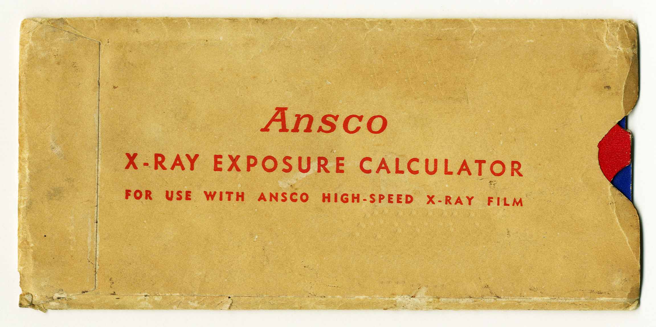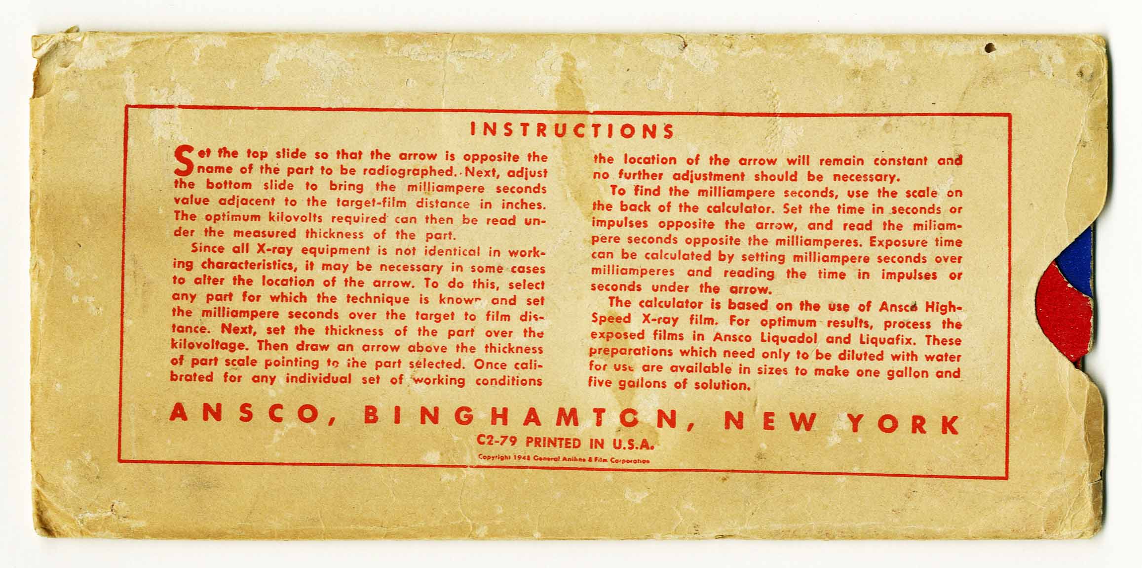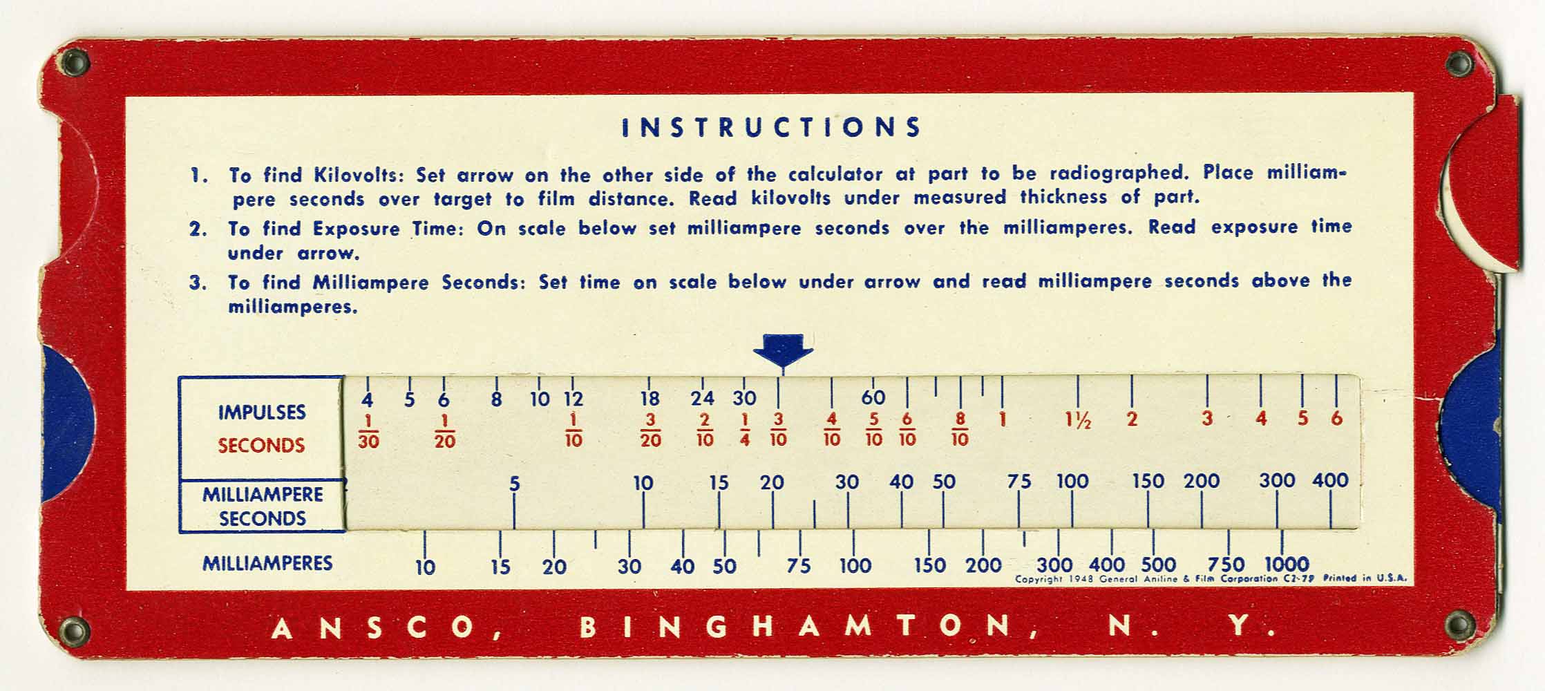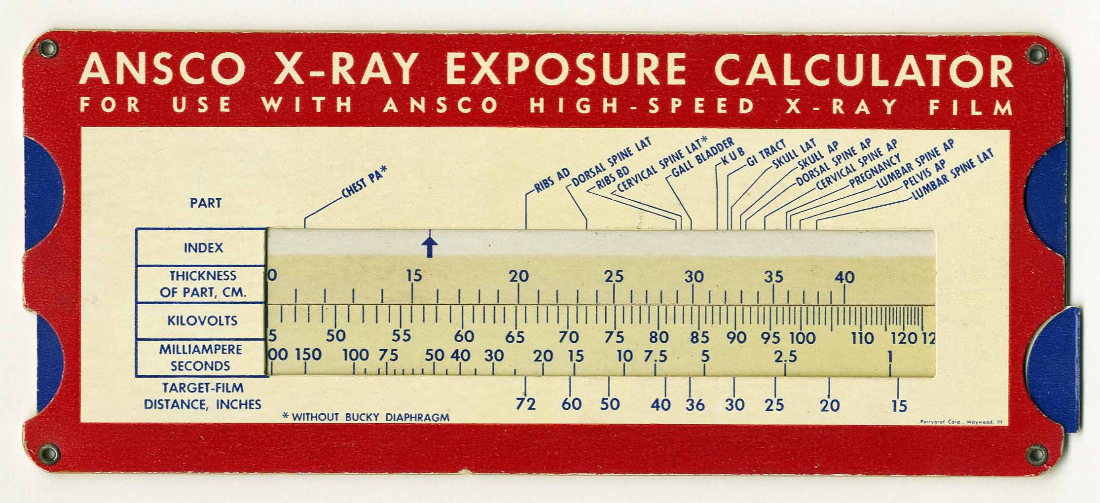 1) Used to calculate exposure settings for high speed X-Ray film 2) Used specifically for medical imaging 3) This slide rule has 2 slides