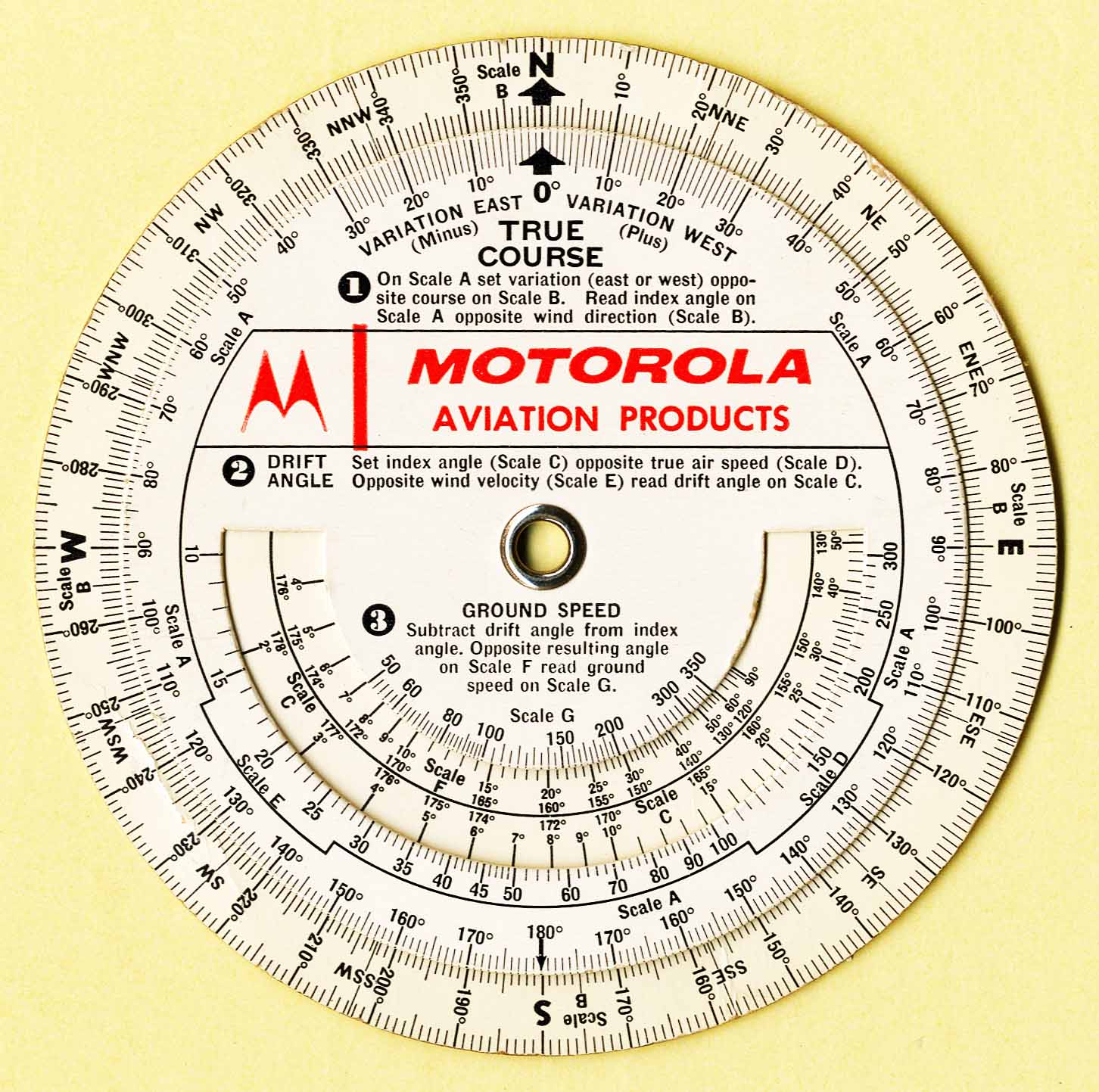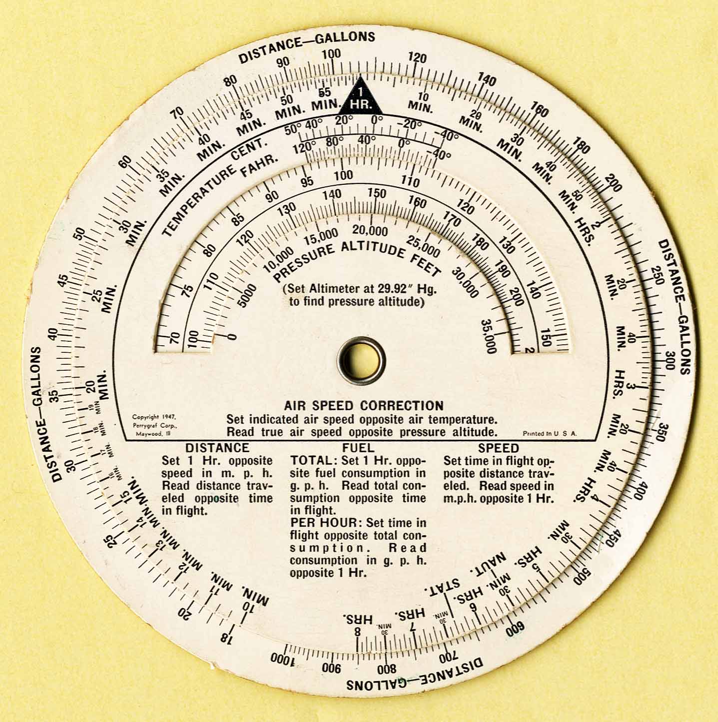 "Advertising computer used to calculate airspeed and altitude corrections including drift, pressure altitude and temperature, as well as fuel calculations"
