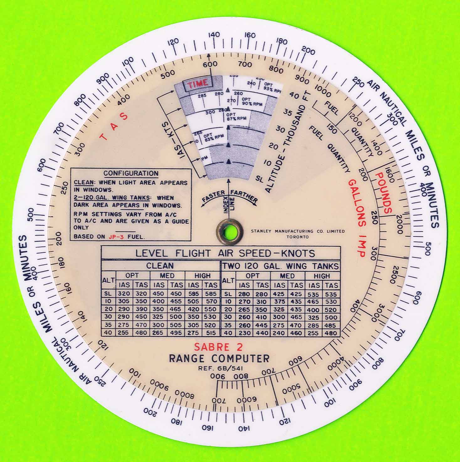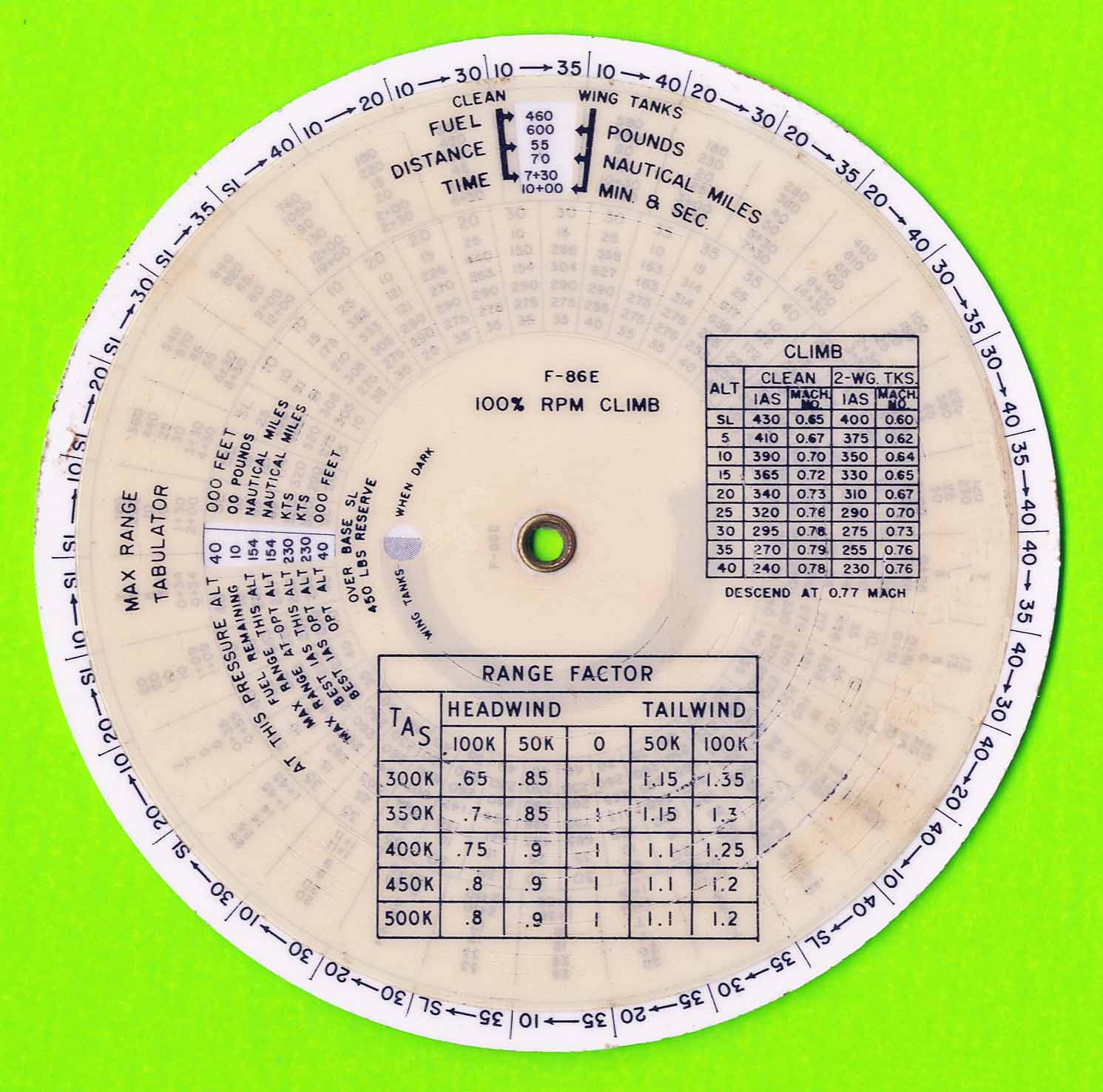"Used to calculate the range versus altitude, fuel load, with and without tip tanks, wind direction and speed etc."