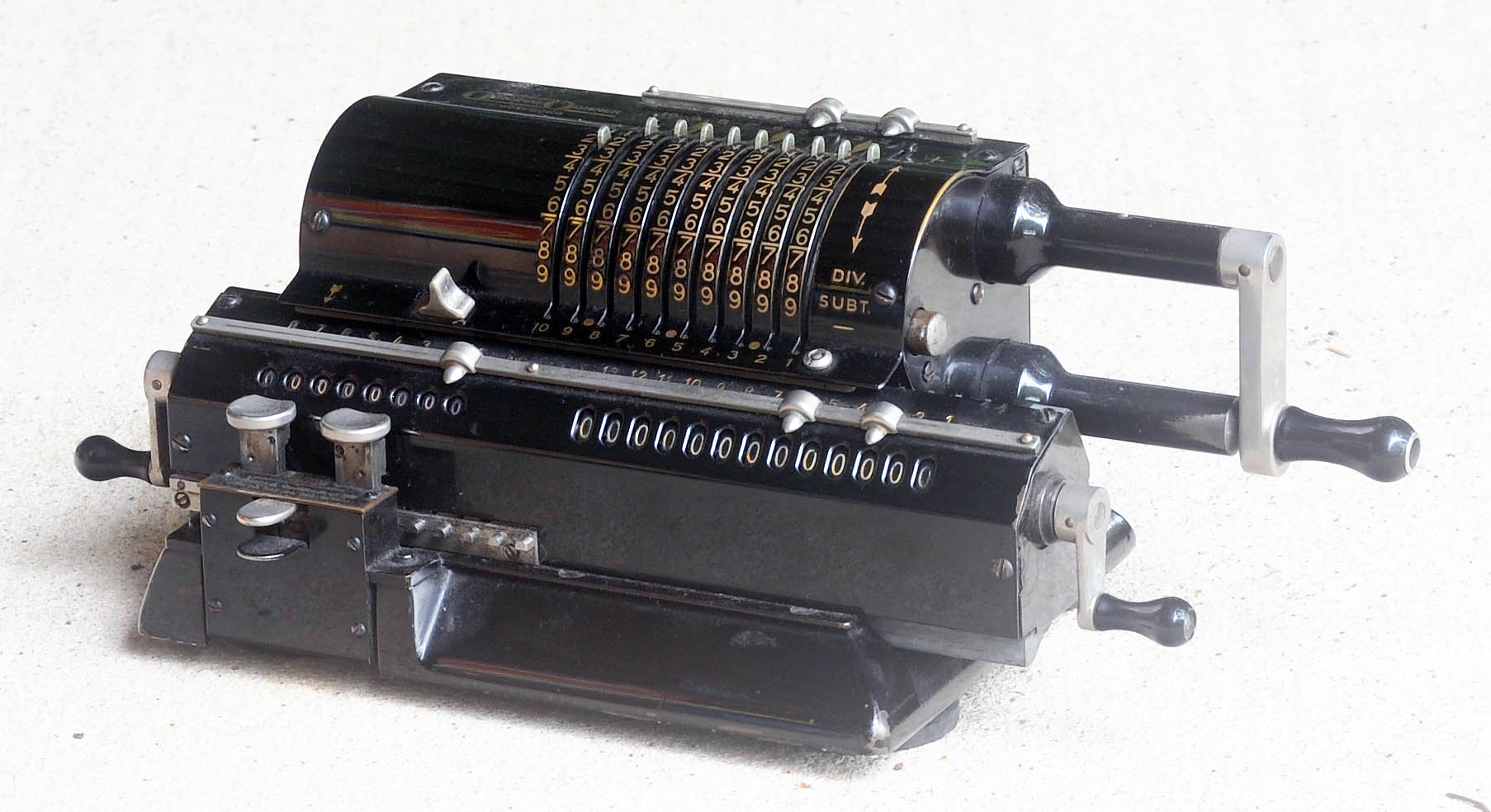 Ten digits for input numbers; 13-digit accumulator. Serial number 7-138006. Still functions properly.