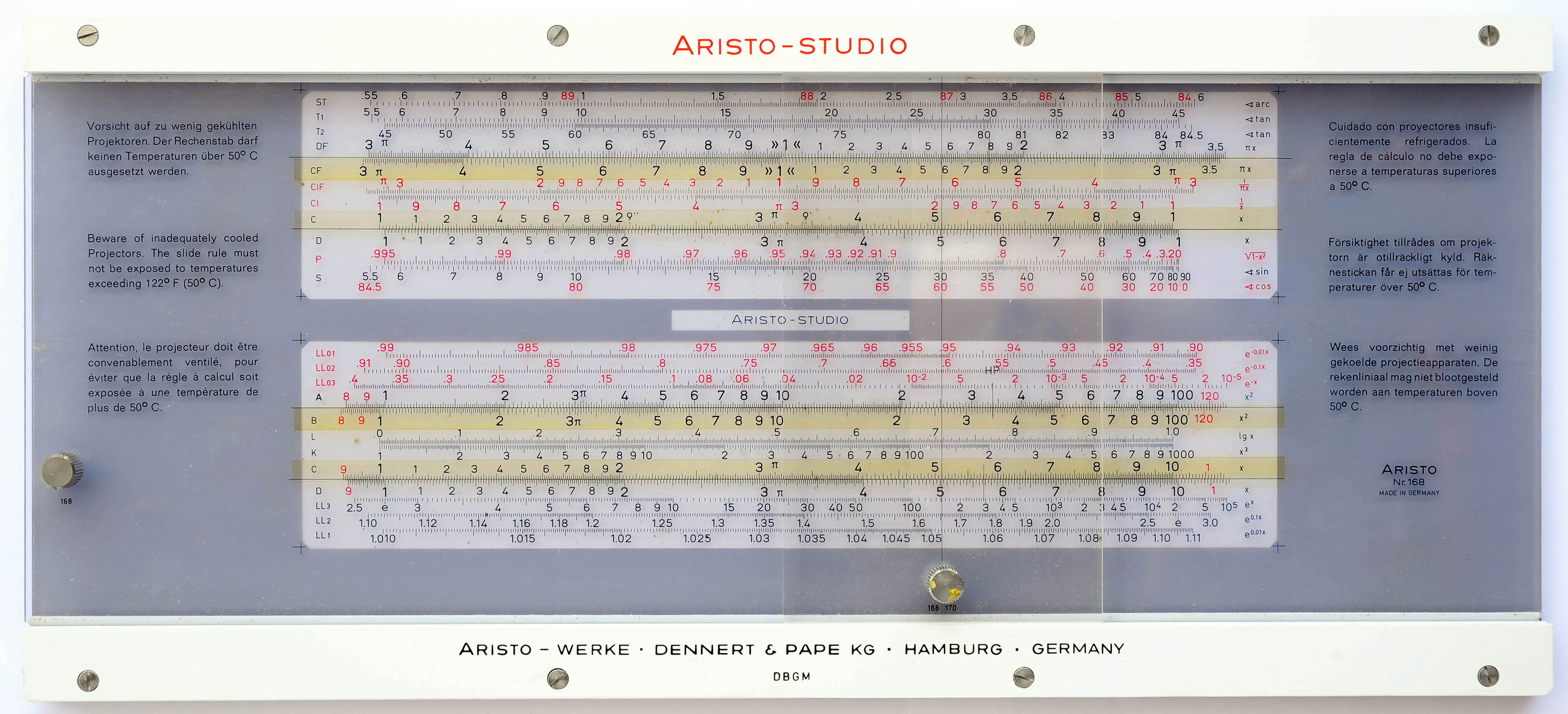 Notes: "This working, transparent rule is designed for use on a classroom overhead projector; the rule scales are identical to the Aristo 0968 Studio slide rule. Note how label on face of rule admonishes users in six languages not to let rule overheat. Instruction manual (PDF) available."