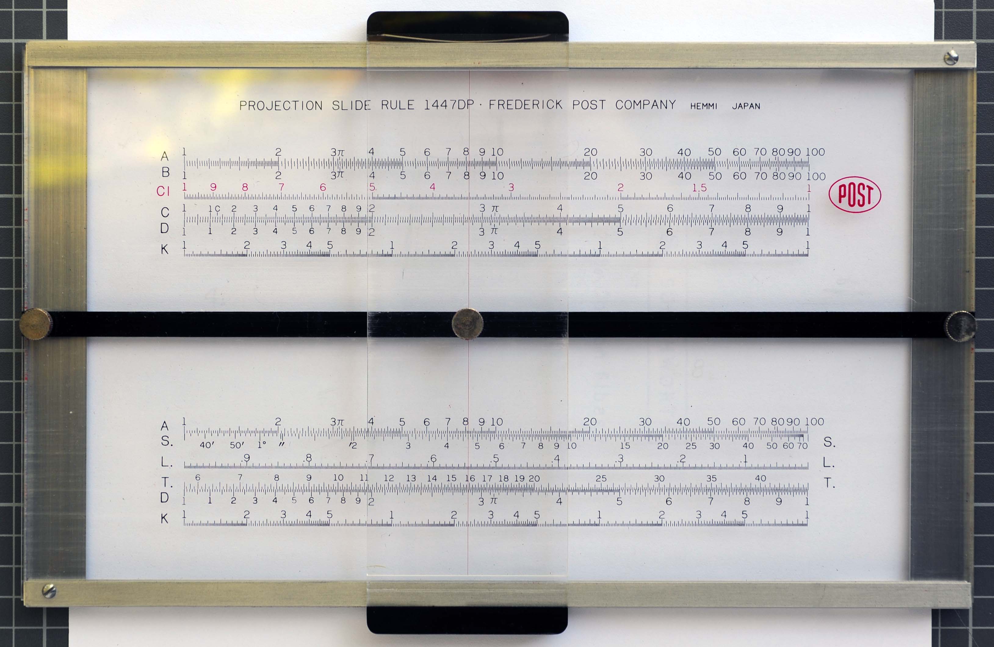 This transparent rule is designed for use on a classroom overhead projector. The scales are identical to the Post 1447 slide rule.