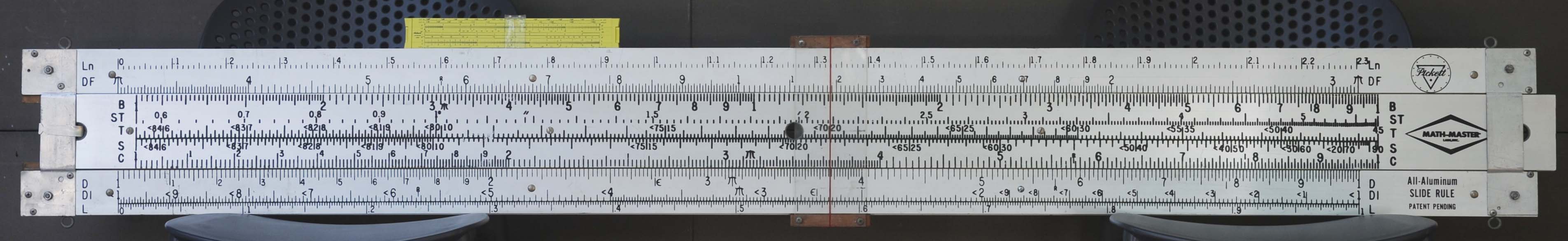 "This is a rare, 7-foot all-aluminum teaching slide rule. Note 25-cm Pickett 140 plastic rule for scale"