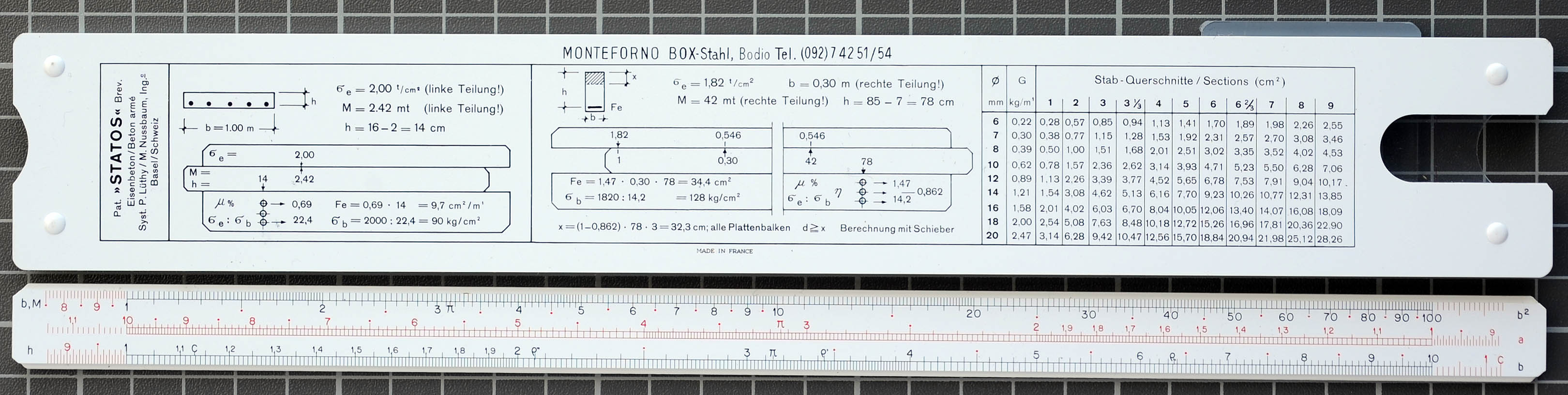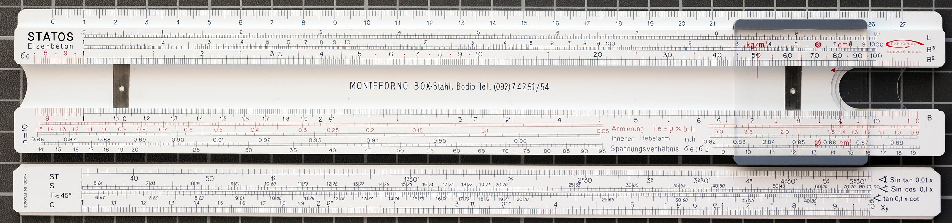 "A handsome rule, labeled with steel works company namd (Monteforno) and telephone number"