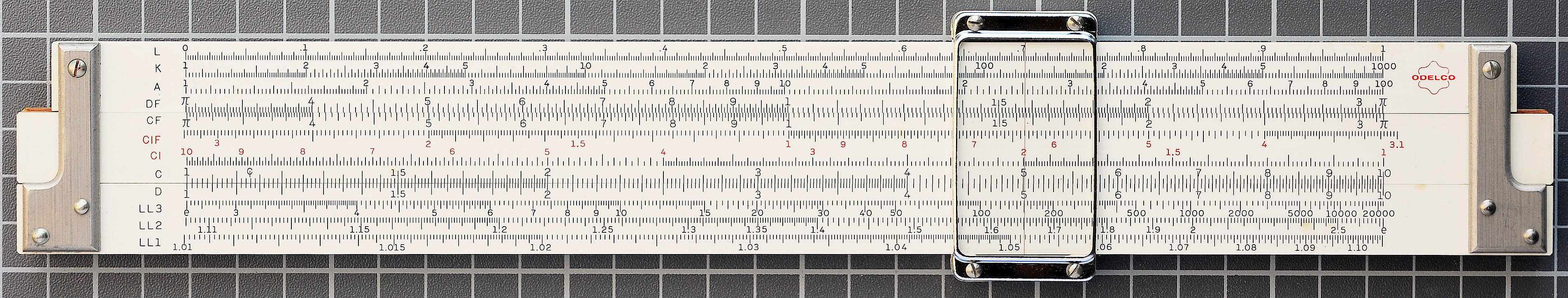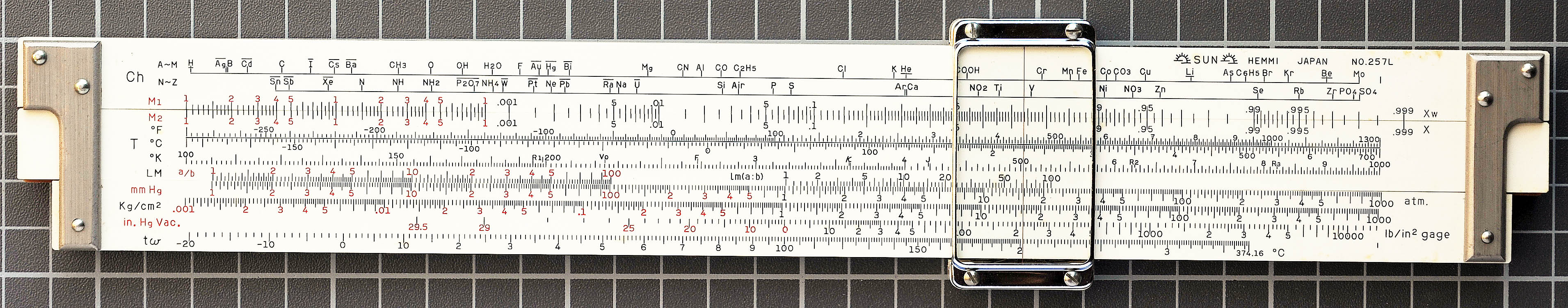 Hemmi date code YF. Note scales with chemical element and compound abbreviations on front of rule.