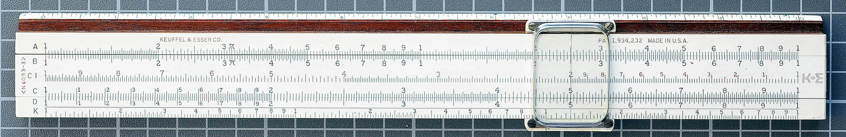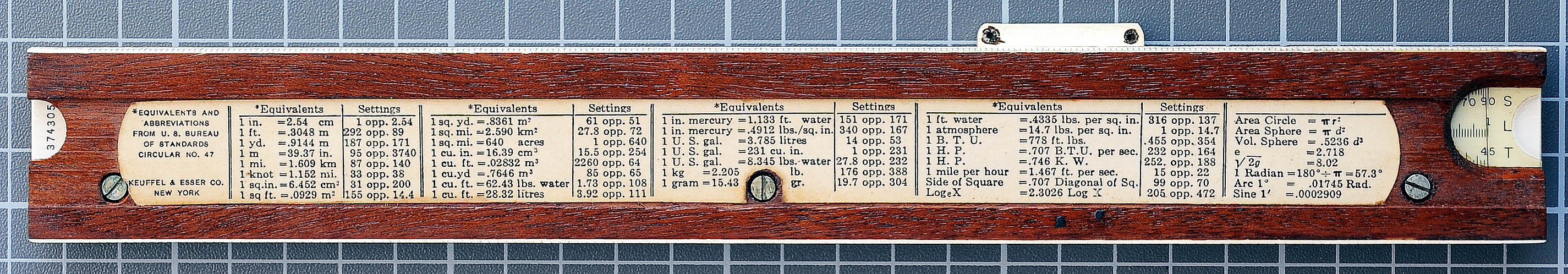 "Serial number 374305. Very utilitarian slide rule — only nine scales: A, B, C, D, CI and K; S, L and T"